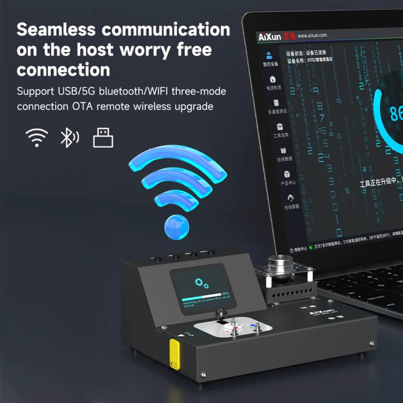 The device is equipped with wireless communication – Bluetooth 5G, Wi-Fi, and USB-C, allowing for instant software updates (OTA), data transfer, and remote calibration. This makes the AiXun DT02 perfectly integrated into modern service stations, offering support in both mobile and stationary modes.