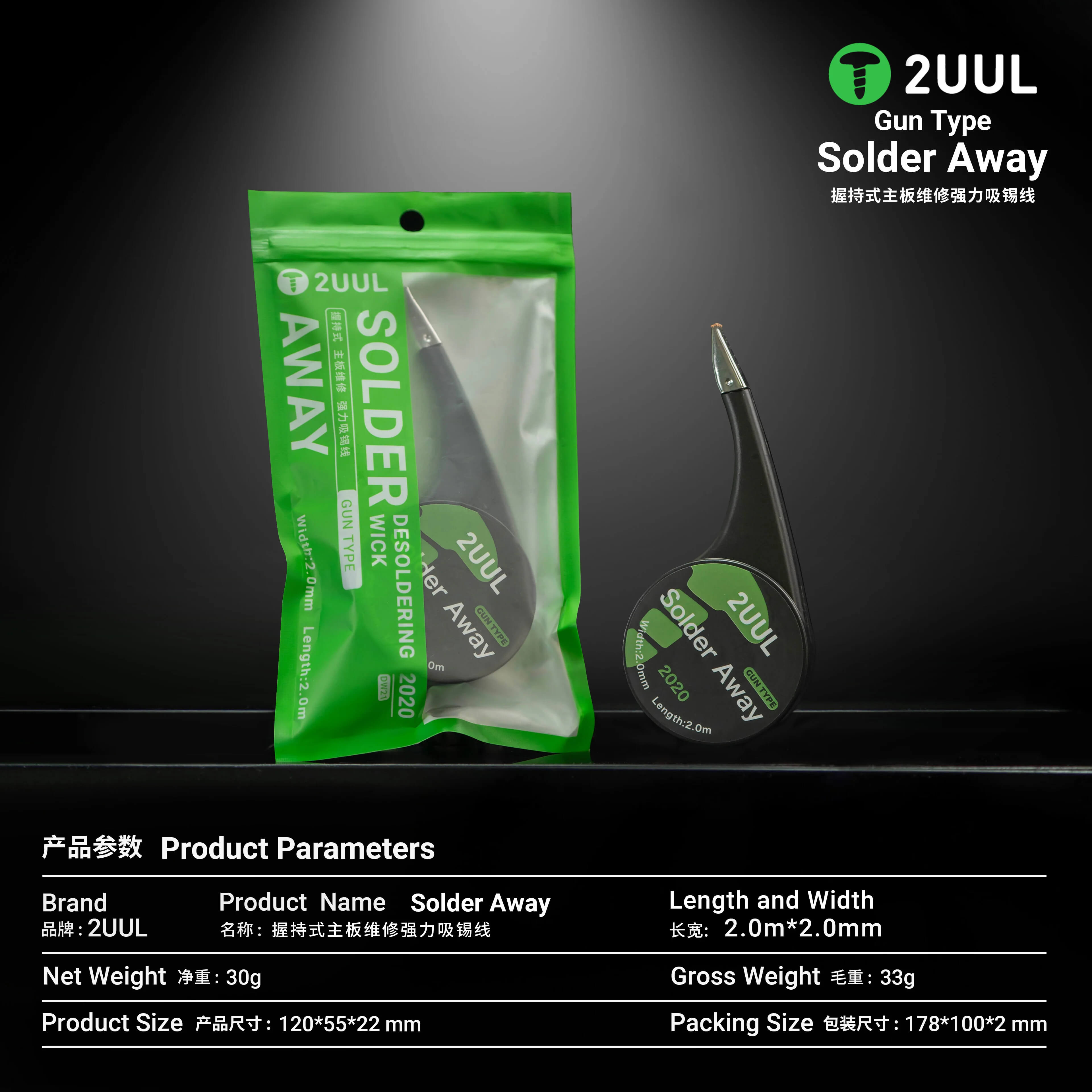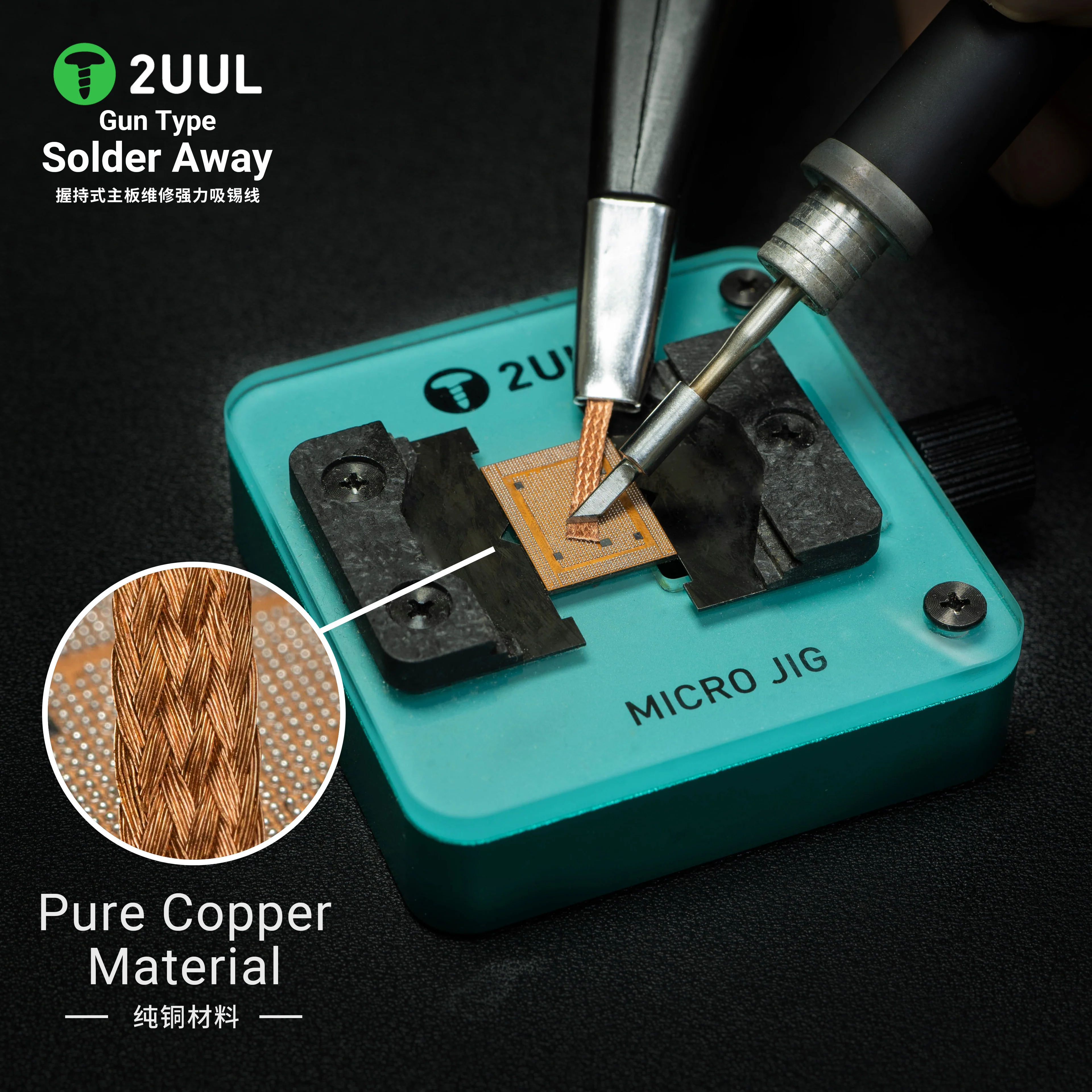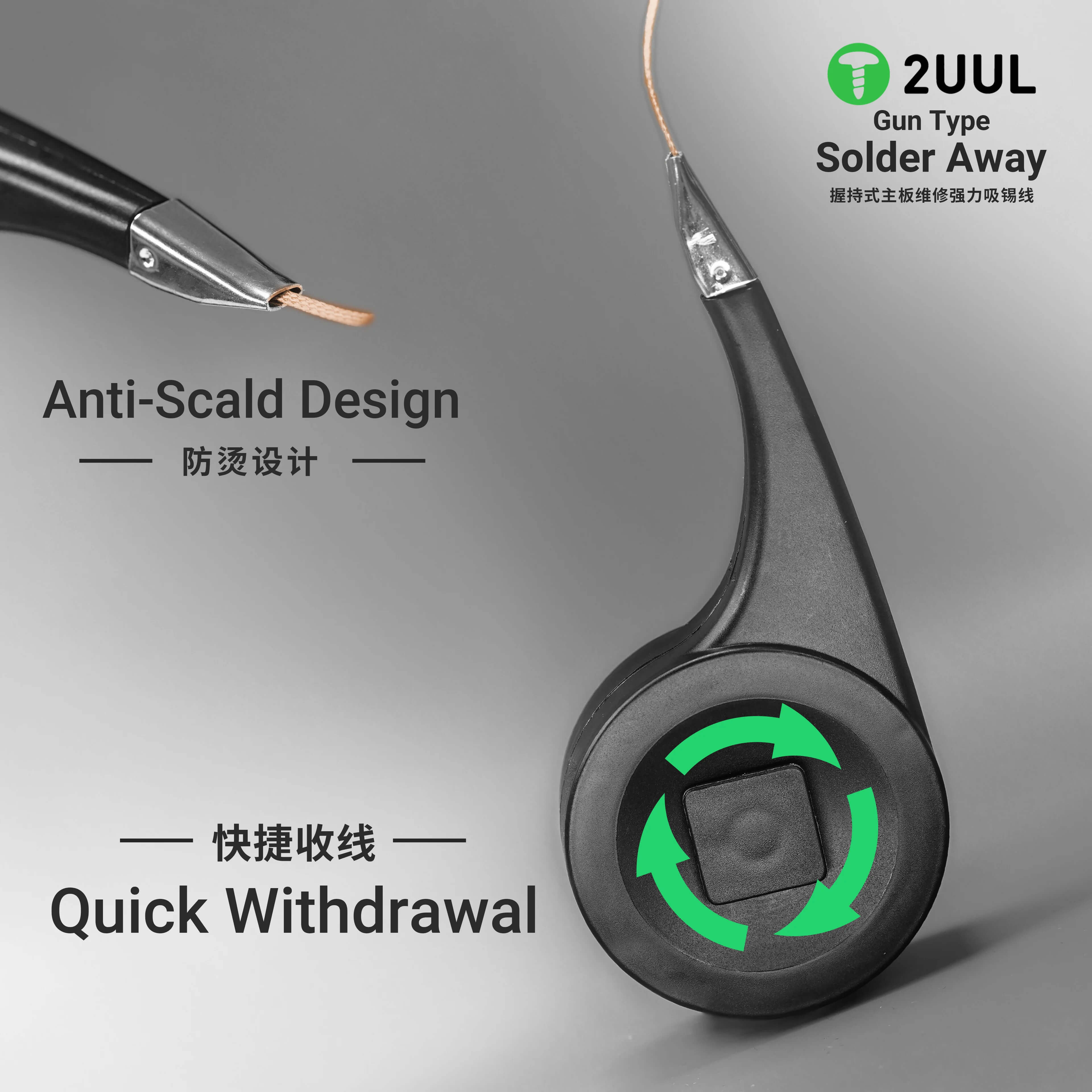 2UUL Solder Away DW21 is a high-quality copper braid for desoldering with an ergonomic "gun" handle. Precisely braided pure copper wire effectively removes excess tin from soldering pads and holes. Rotating spool, anti-burn steel tip and light, comfortable design make the tool ideal for working with precision electronics, including SMD and BGA systems.