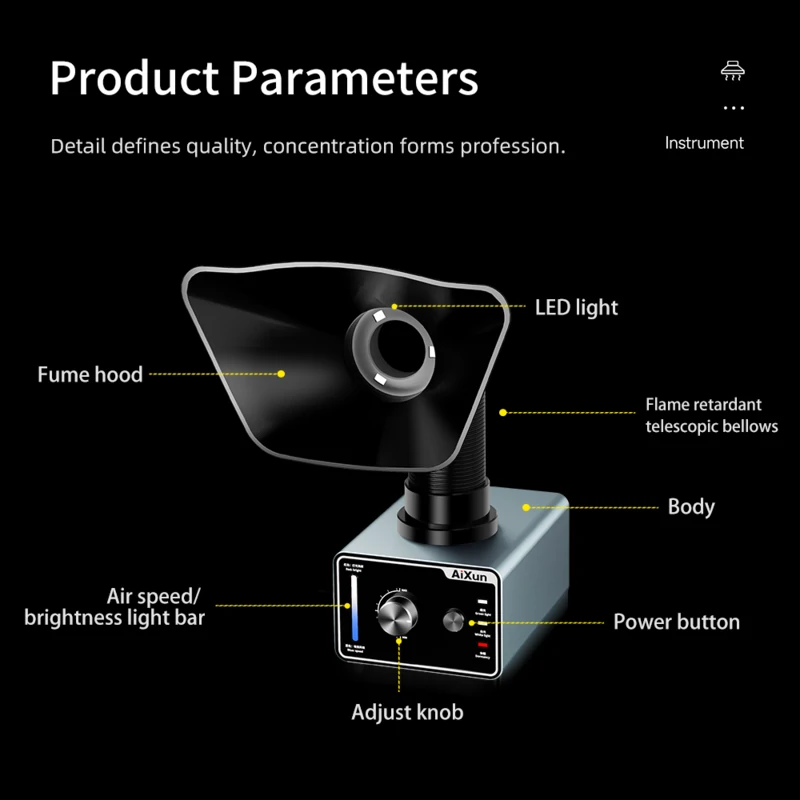 AiXun ES02 is a compact and efficient soldering smoke absorber,equipped with dual LED lighting, HEPA + activated carbon filtration and a quiet 4000 rpm fan. The flexible, telescopic tube allows you to adjust the angle suction, and one-button start and the possibility of connecting via Bluetooth and USB-C make the operation simple and modern. The solid aluminum housing and intelligent functions make it the ideal tool for electronics service.