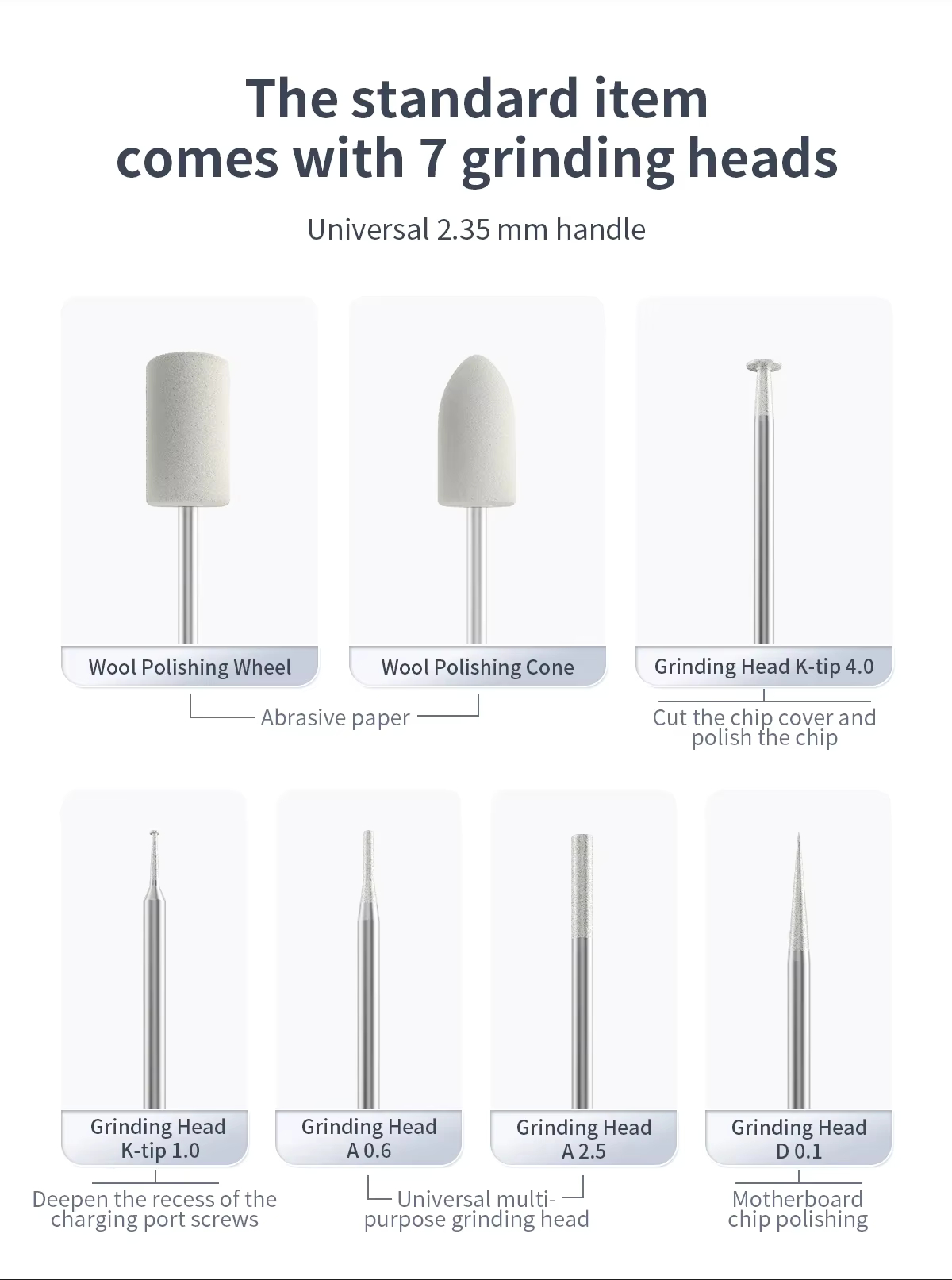 The set includes 7 tips: a felt roller and a polishing cone, as well as K-tips, A-tips, and D-tips for various service applications.