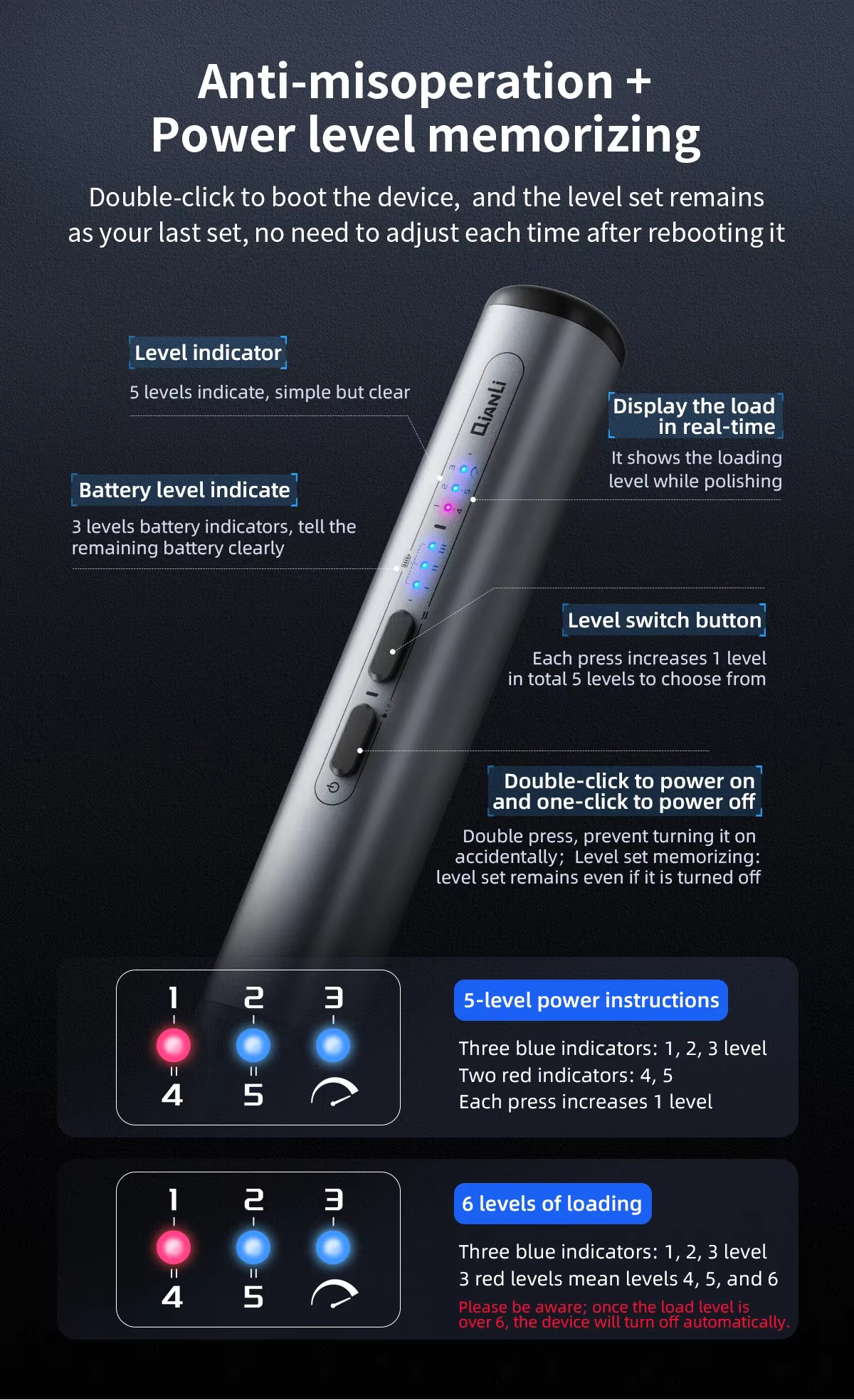 | Indicators | LEDs: power level (5), battery level (3), real-time load |