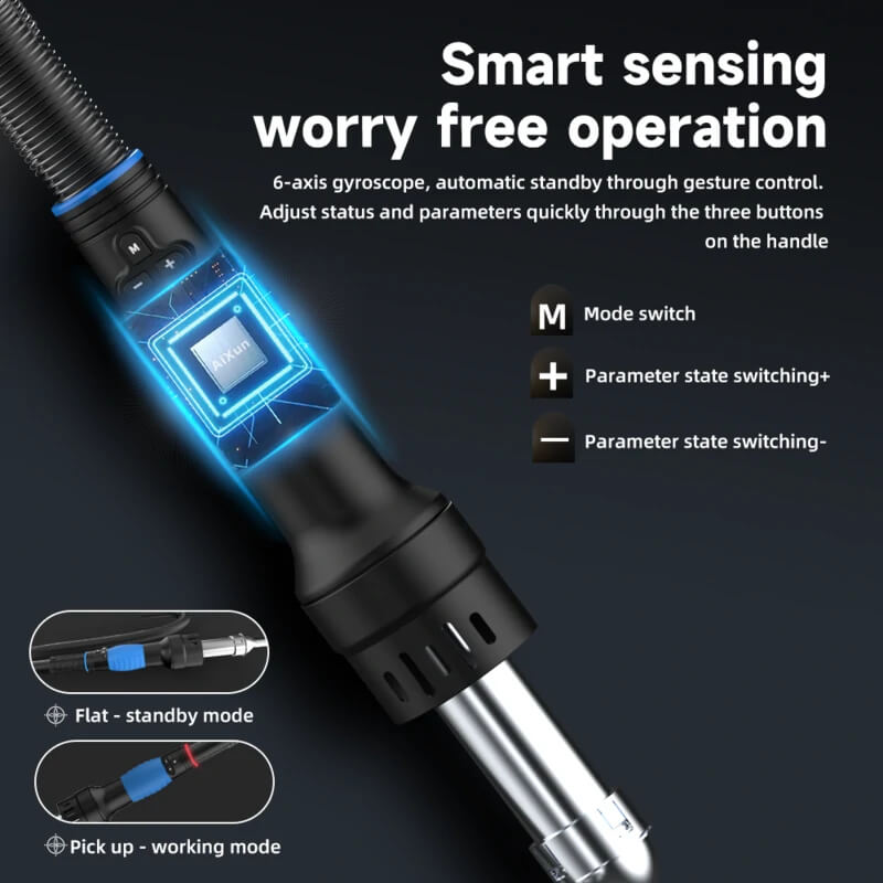 AiXun H414D is a modern hot-air soldering station, designed for professional repair shops and demanding users. Thanks to two independent channels and a power of up to 3200W, it ensures instant heating and maximum work efficiency.
