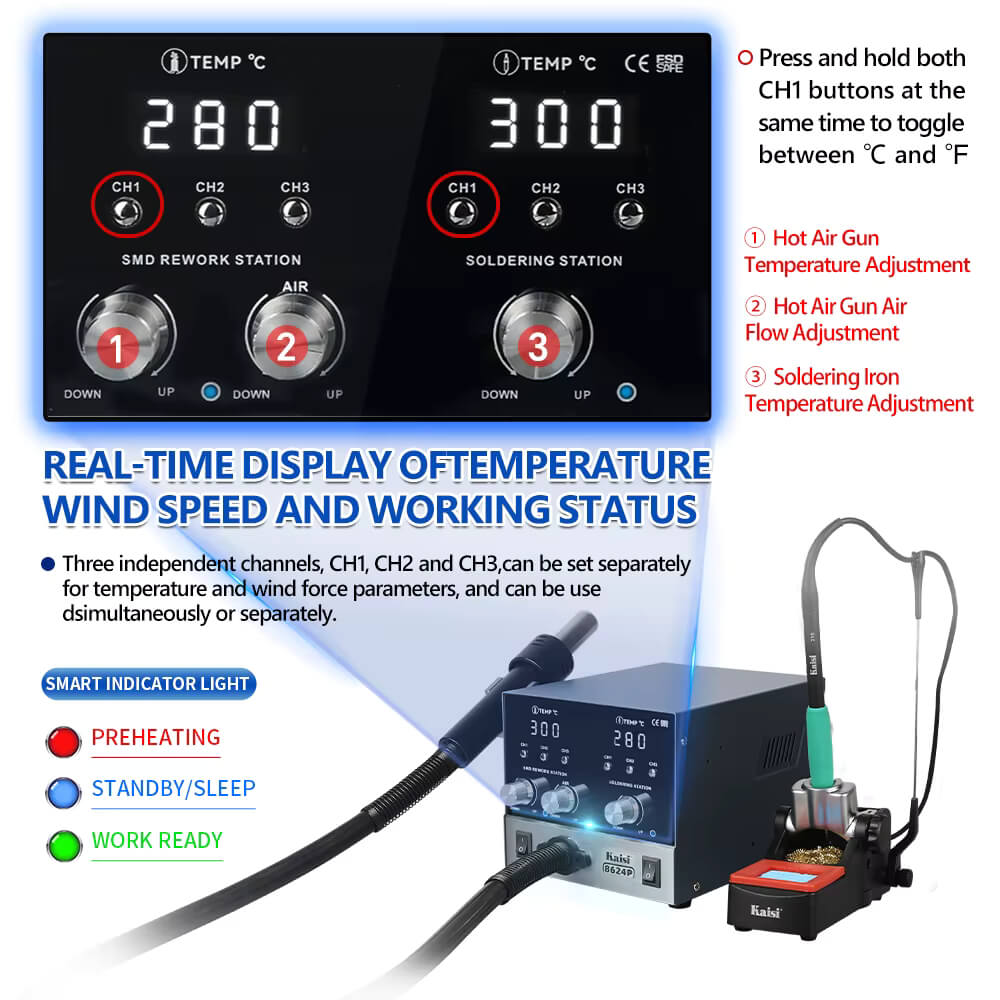 The large, clear display shows temperature, blower speed, and current operating status in real time. Three independent channels CH1 / CH2 / CH3 allow you to save and quickly switch operating settings.