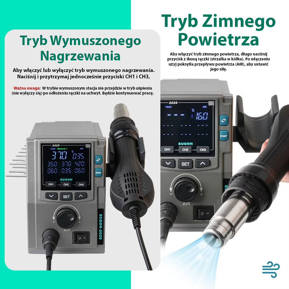 The Sugon 2026 station is equipped with advanced digital control system that allows for precise temperature and airflow setting. The clear LCD display presents all operating parameters in real time, ensuring full control over the soldering and desoldering process.