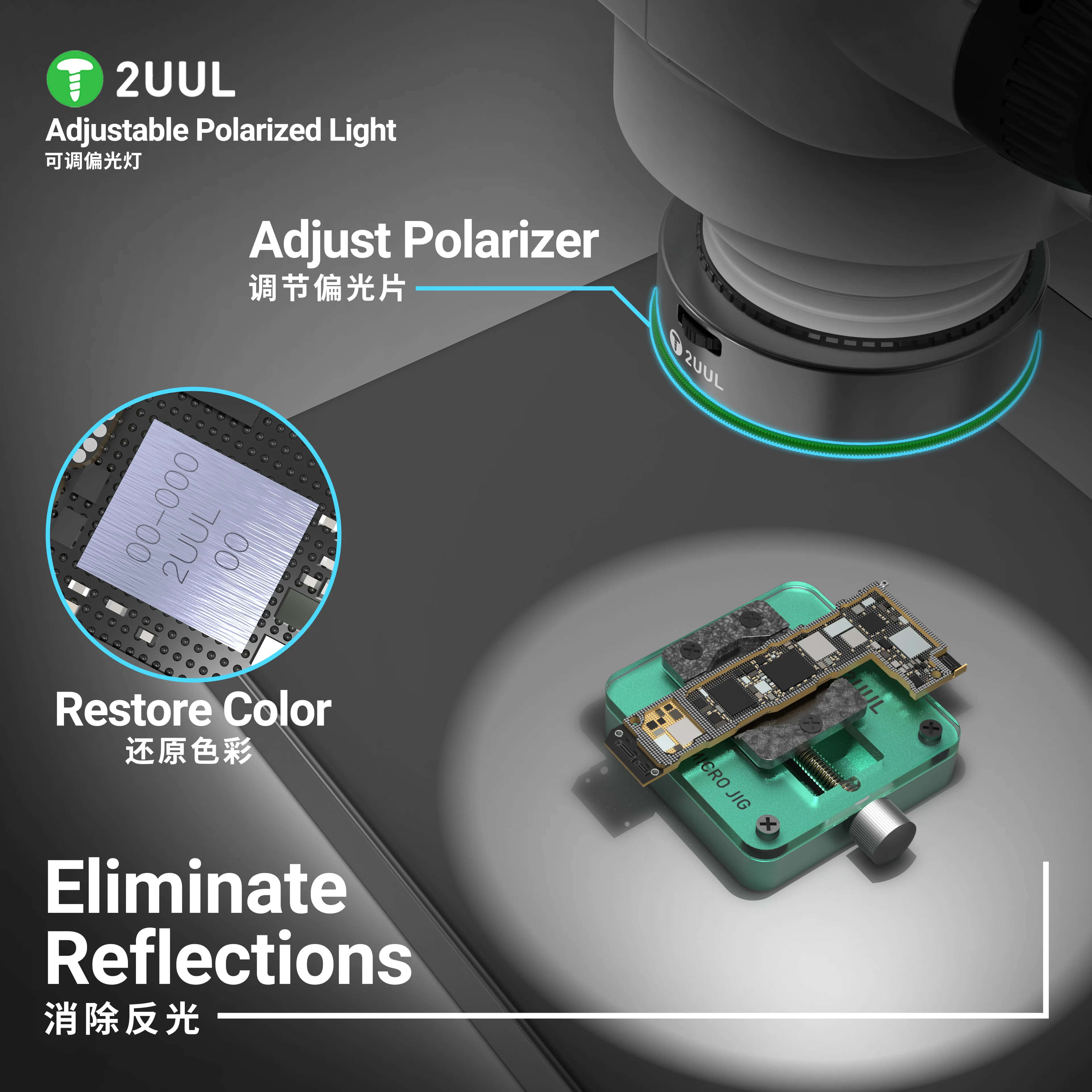 Ideal light for micro-repairs and precision soldering of electronics! 2UUL MS97 is a modern ring light equipped with 32 bright LEDs and a polarizer, which eliminates reflections and restores the natural, faithful colors of the observed object. This makes working under a microscope, especially when repairing BGA and other delicate components on smartphone motherboards, more precise and comfortable. The lighting is resistant to dust, oil and smoke, and the durable metal housing effectively dissipates heat, ensuring long-term and trouble-free operation.