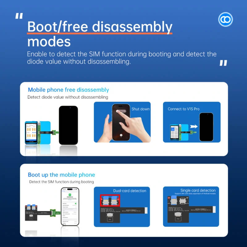 Non-disassembly mode – turn off the phone, connect the adapter to the V1S Pro / V1SE and measure the diode value without opening the device.