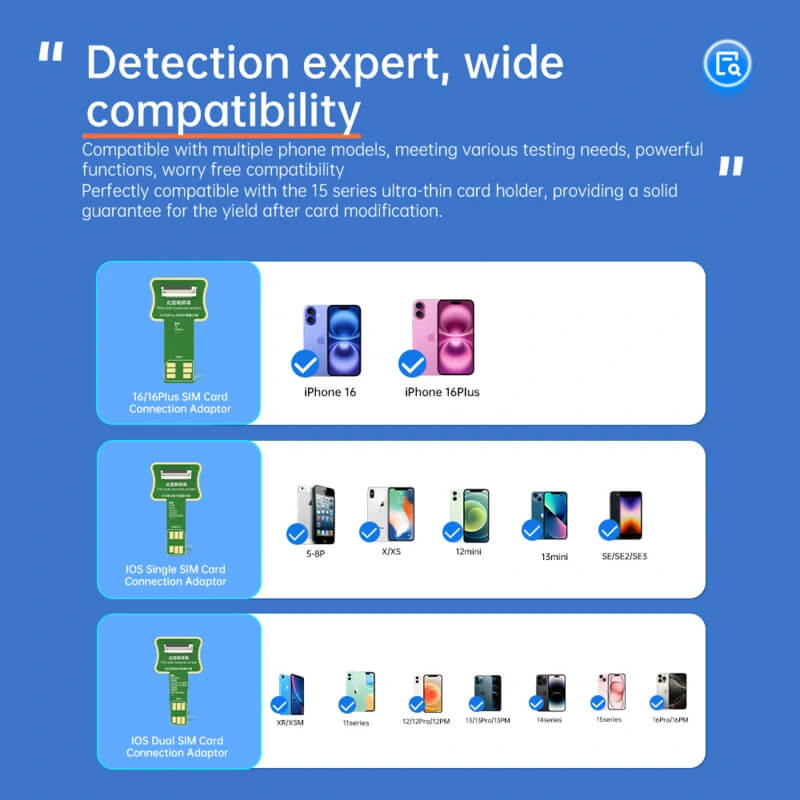 The kit is compatible with JCID V1S Pro / V1SE, supports iPhone 5–16 PM (single and dual SIM, including the 15 and 16 series with an ultra-thin slot), and Android devices with SIM and TF card slots. ENIG technology guarantees durability, and intelligent security protects against damage during testing.