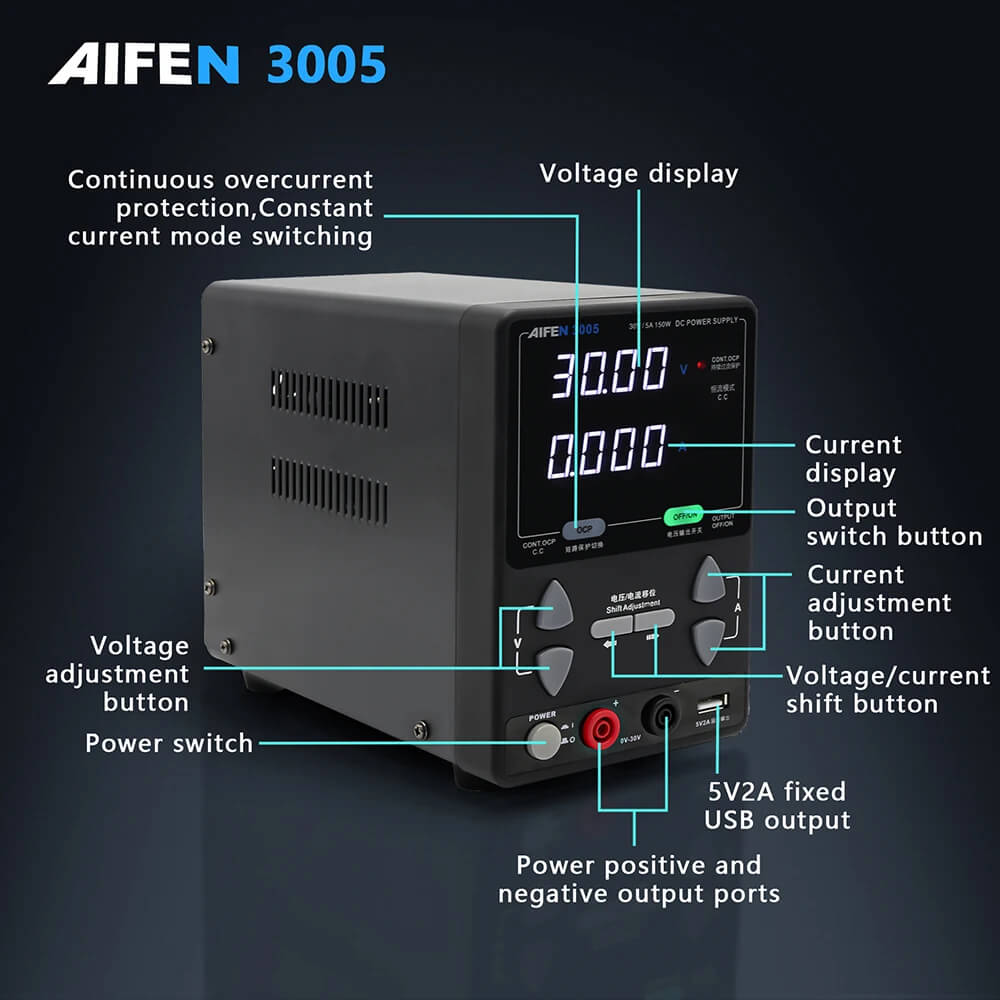 The AIFEN 3005 professional service power supply provides precise voltage and current output, making it an ideal tool for electronics technicians, service technicians, and hobbyists.
