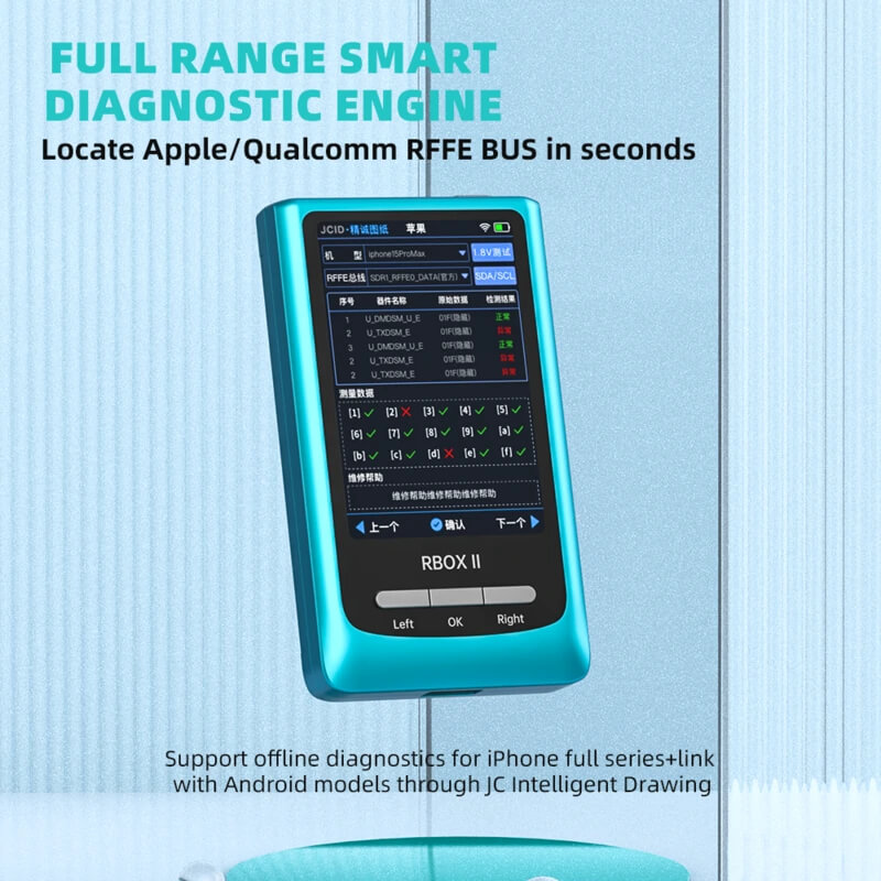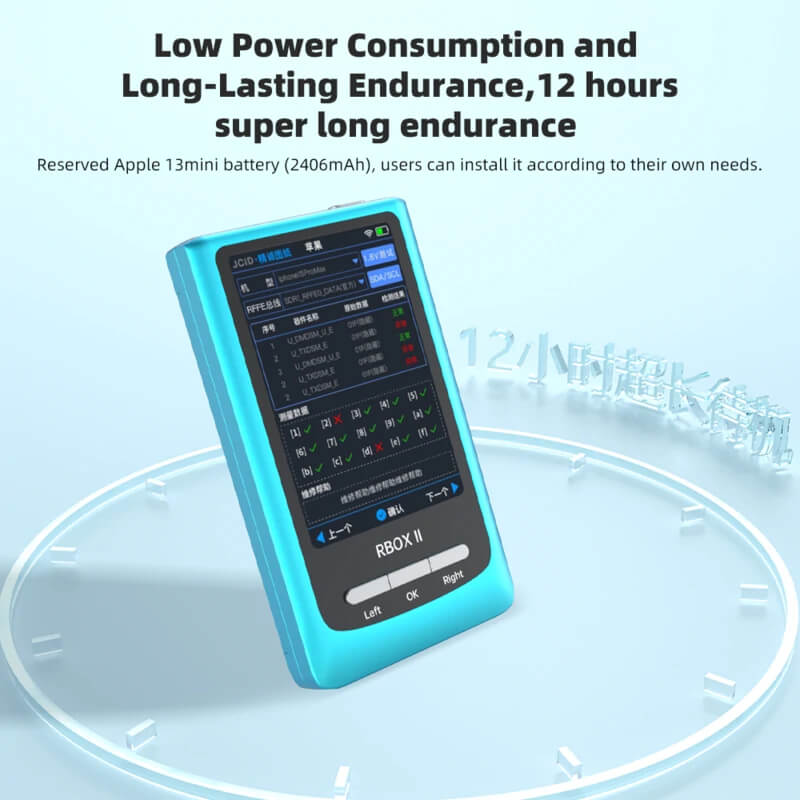 JCID RBOX II is a compact diagnostic device, ideal for testing RFFE BUS in Apple and Qualcomm devices. Thanks to the speed of problem detection and support for offline diagnostics, the device allows for precise fault localization in RFFE systems. A new feature in version II is the UART voltage regulation function, which improves compatibility. RBOX II is also equipped with a buzzer that informs about errors and short circuits, and also offers the possibility of updating the database via WiFi or USB. The device also allows for the installation of a battery from iPhone 13 mini (2406mAh), but the battery is not included in the set.