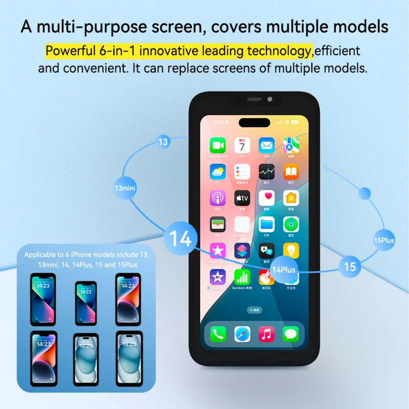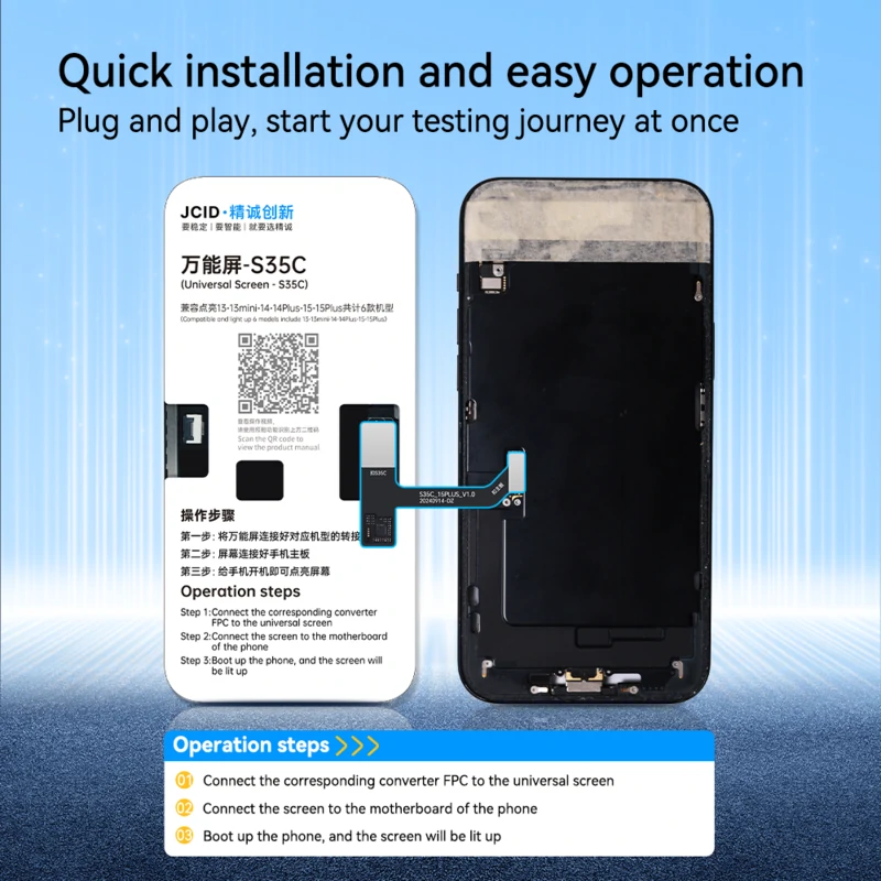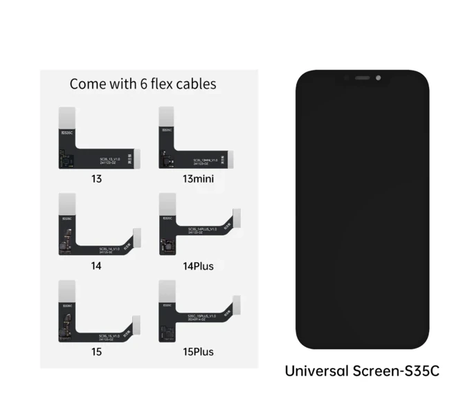 The JCID S35C was designed as a universal 6-in-1 test display, compatible with the following models: style="color: #2e5984;">iPhone 13, 13 mini, 14, 14 Plus, 15 and 15 Plus. This practical solution streamlines daily service work, reduces testing time, and allows you to quickly verify the device's operation after repair.
