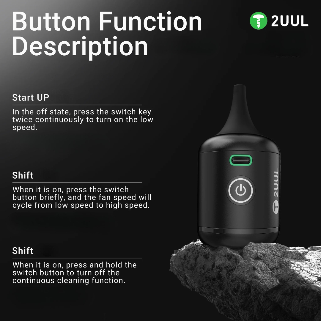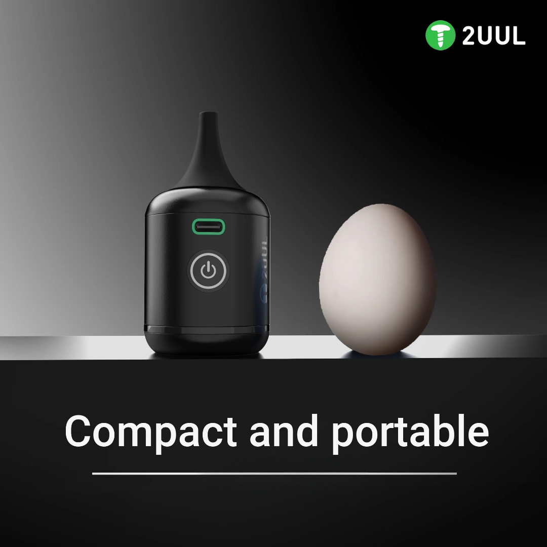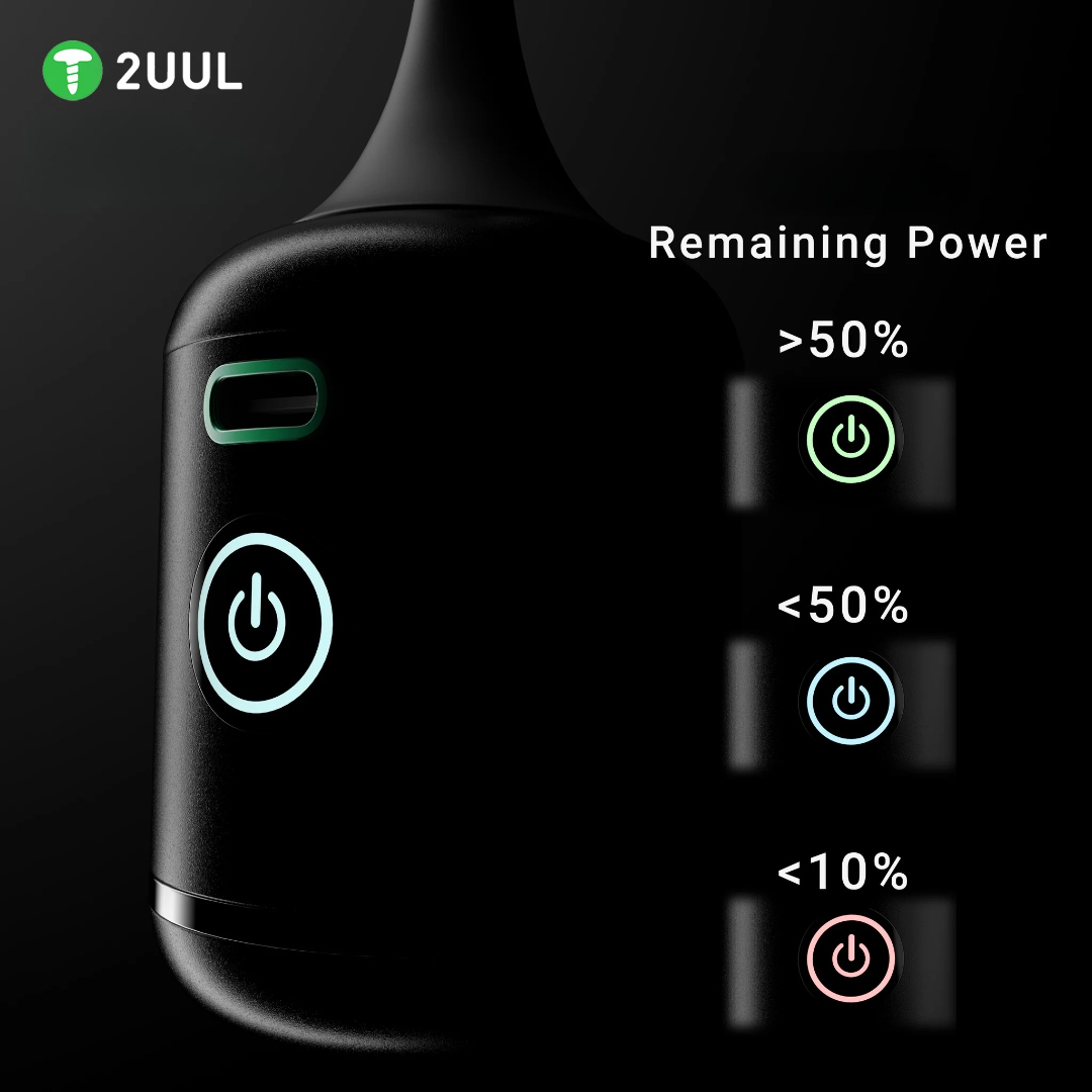 The 2UUL BB Nano DA90 combines high blowing force with mobility. The directional nozzle allows you to blow dust out of hard-to-reach places (ports, sockets, connectors), and the air stream quickly cools sensitive systems during soldering or testing. Operation is incredibly simple: two speed modes, a clear charge indicator, and fast charging via USB-C.
