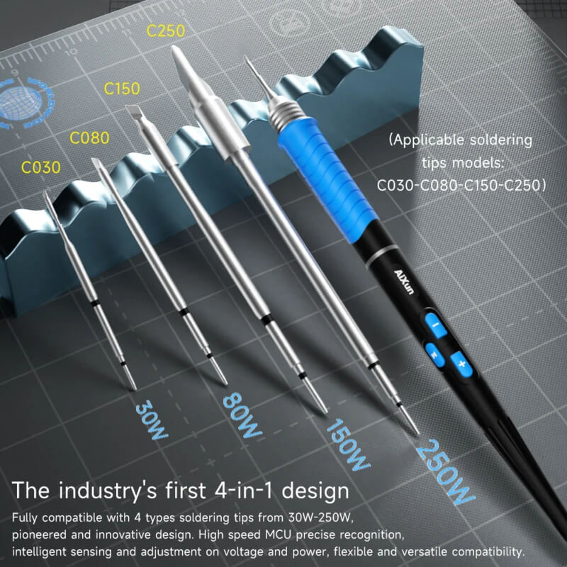 Supports AiXun C250, C150, C080 and C030 series soldering tips, eliminating the need to use multiple holders.