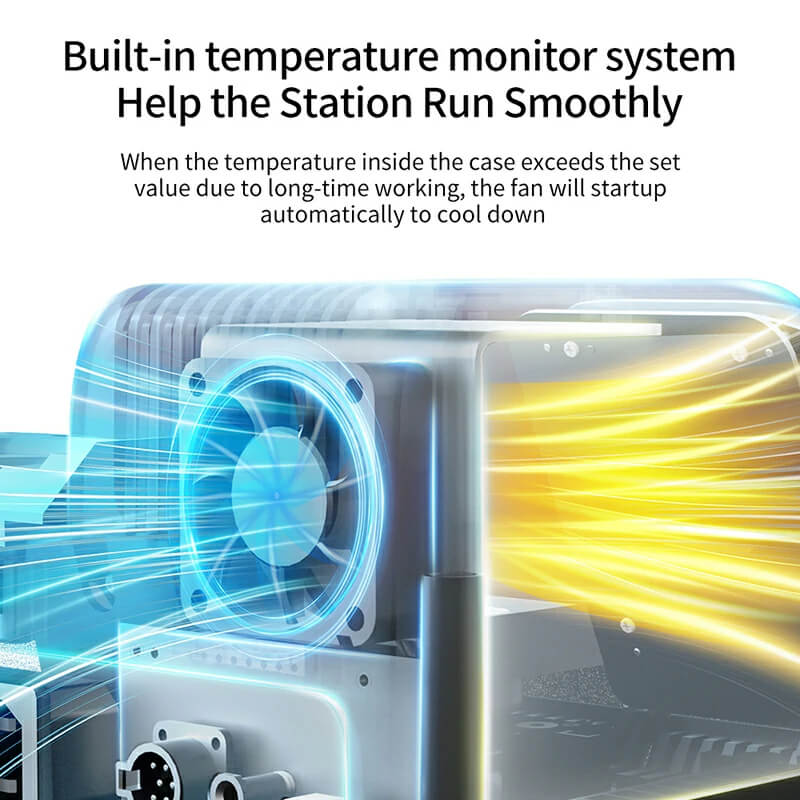 Built-in temperature monitoring system: The station is equipped with a temperature monitoring system that automatically starts the fan when the temperature inside the device exceeds a safe level, ensuring stable operation for a long time.