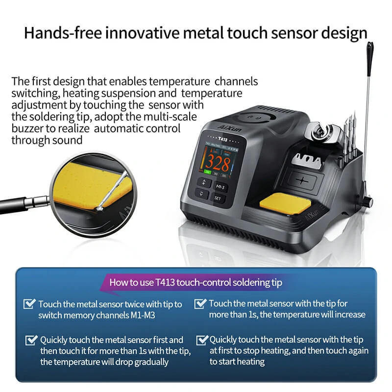AiXun T413 is an advanced soldering station, designed for professionals soldering PCBs, SMDs and BGA systems. Equipped with an innovative metal touch sensor, it enables non-contact temperature control and memory channel switching using just the tip. Thanks to intelligent PID control, the device heats up to 450°C in just 2 seconds, ensuring precise temperature settings. The station supports remote control via WiFi and Bluetooth, allowing easy device management and software updates using OTA technology. 2.4" HD screen enables convenient operation and personalization of settings, and the temperature monitoring system ensures stable and safe operation.