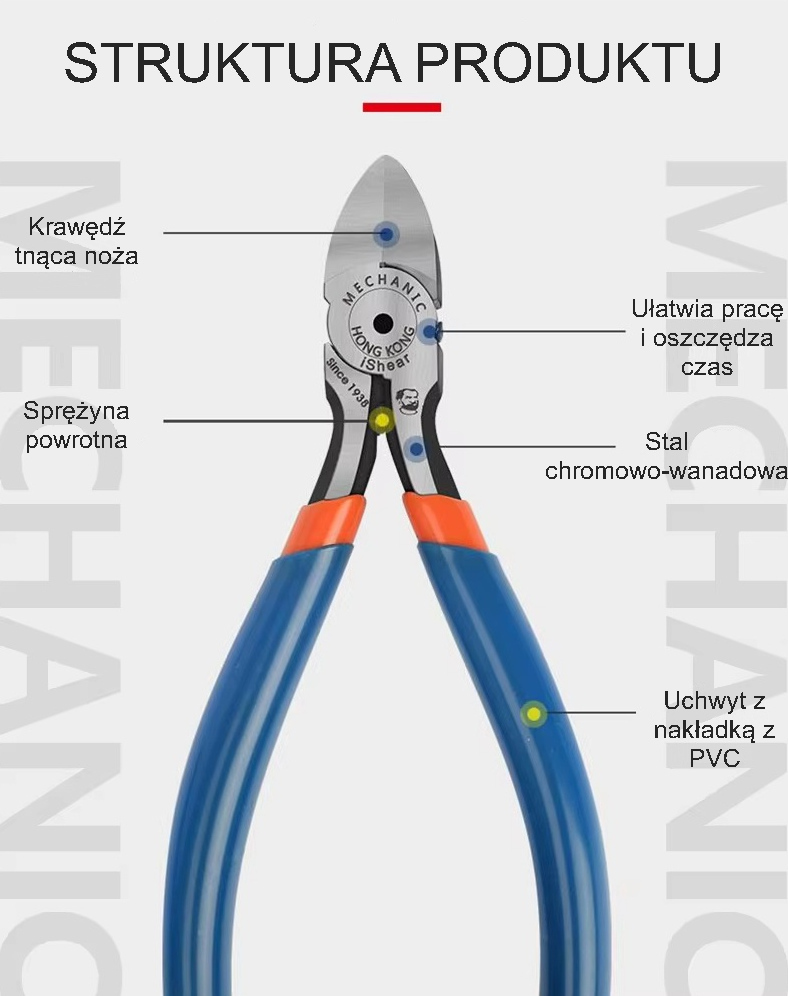 Mechanic iShear to szczypce klasy premium, stworzone z myślą o profesjonalistach. Wykonane ze stali chromowo-wanadowej, z ostrzami hartowanymi na wysoką częstotliwość, gwarantują niezrównaną trwałość i precyzję cięcia, nawet intensywnym użytkowaniu.
