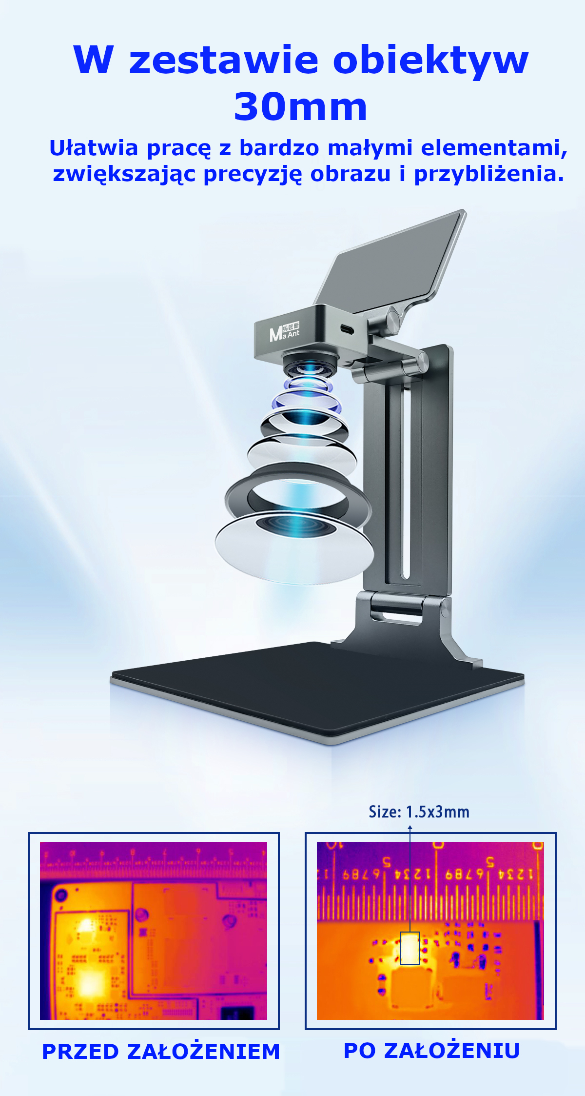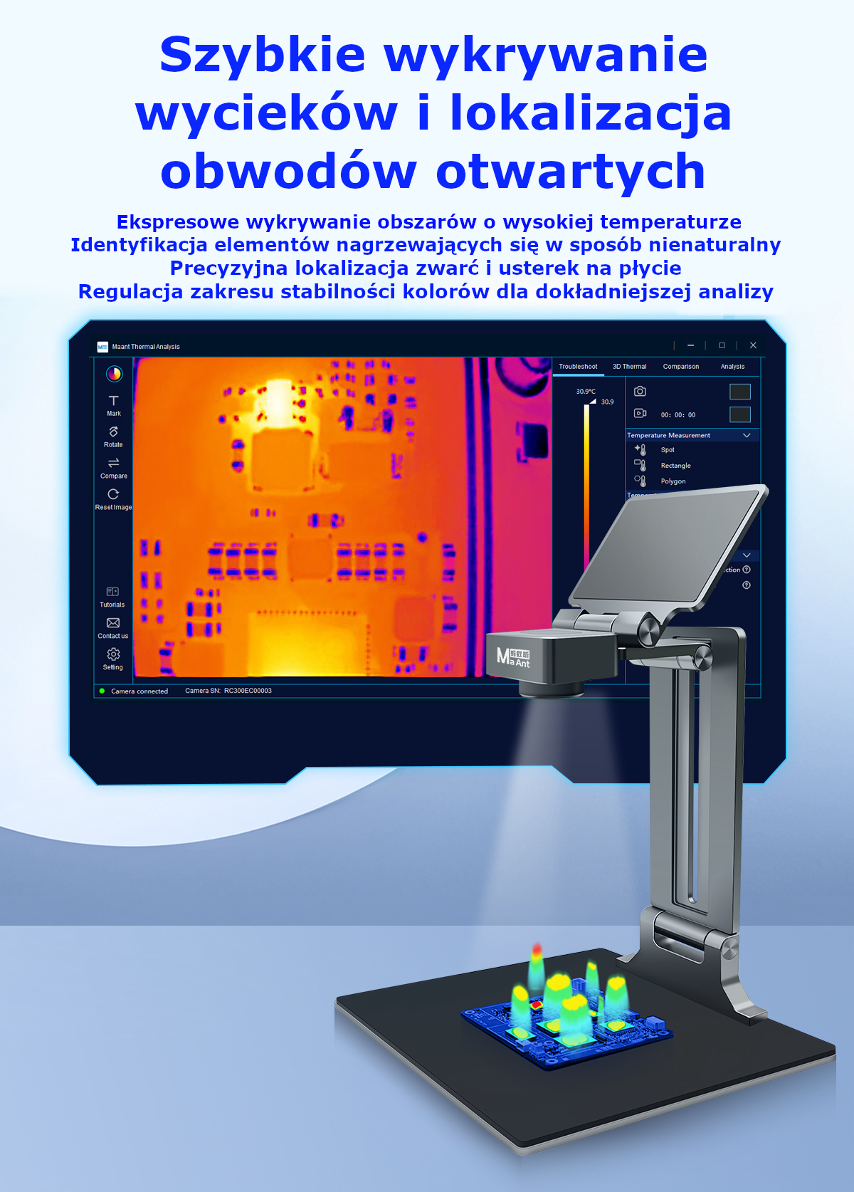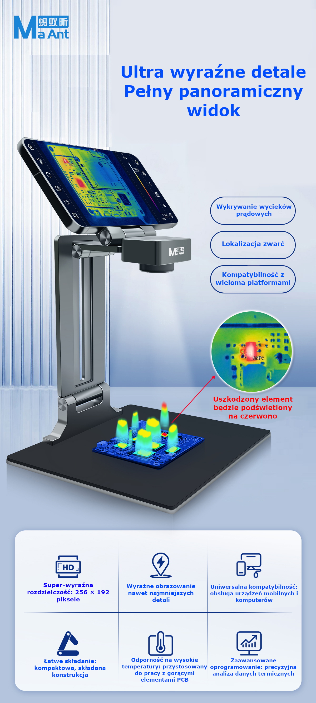 🔥 Kamera Termowizyjna Ma Ant Thermal Imaging Analyzer – szybkie i precyzyjne wykrywanie usterek na płytkach PCB. Sprawdź przegrzewające się elementy, zwarcia i wycieki prądowe w czasie rzeczywistym dzięki nowoczesnej kamerze termowizyjnej trzeciej generacji.