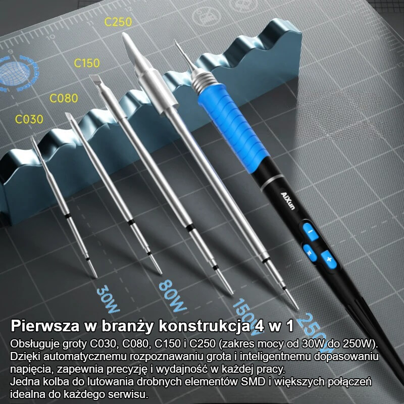 Obsługuje groty lutownicze AiXun serii C250, C150, C080 i C030, eliminując konieczność używania wielu uchwytów.