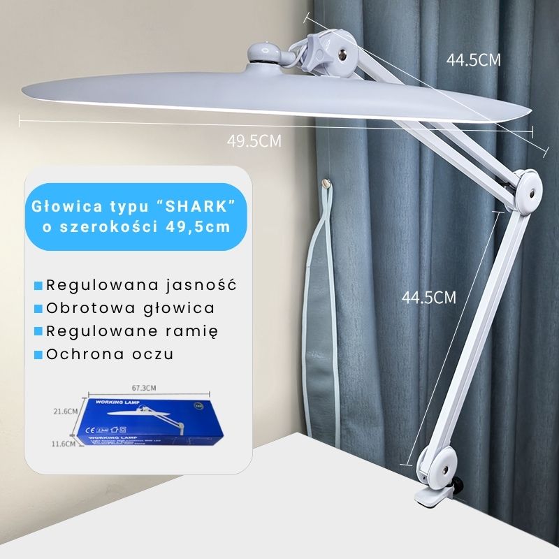 Lampa KM-01 powstała z myślą o serwisantach elektroniki, technikach GSM i każdym, kto pracuje przy płytach głównych, układach scalonych i precyzyjnych komponentach elektronicznych. Szeroki panoramiczny klosz „Shark" (49,5 cm szerokości) zapewnia jednorodne, bezcieniowe oświetlenie całego stanowiska serwisowego – bez martwych punktów, bez odblasków, bez cieni utrudniających pracę przy drobnych elementach SMD.