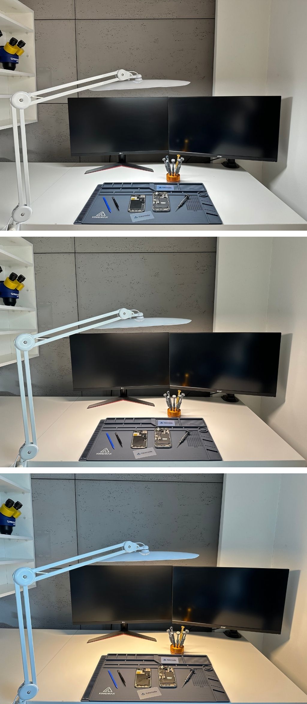 Praca przy płytach głównych, modułach BGA czy gniazdach ładowania wymaga perfekcyjnej widoczności. KM-01 oferuje mocne światło LED 24W o barwie zbliżonej do dziennej, dzięki czemu dostrzeżesz nawet mikrouszkodzenia, spękane luty i zanieczyszczenia niewidoczne w zwykłym oświetleniu.