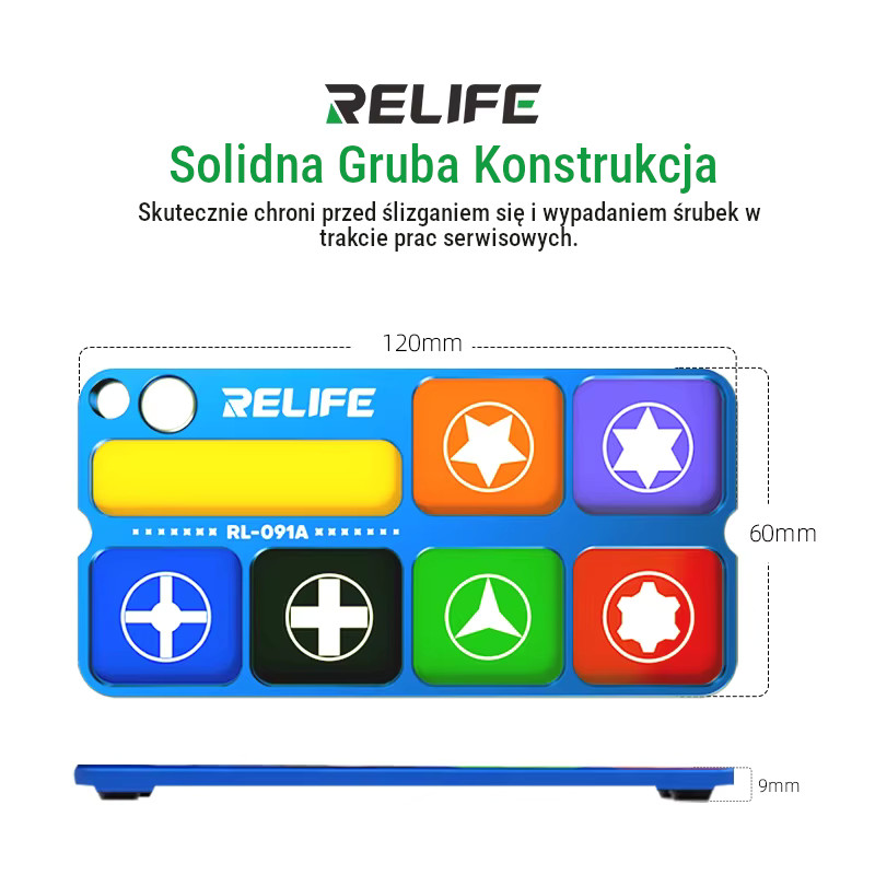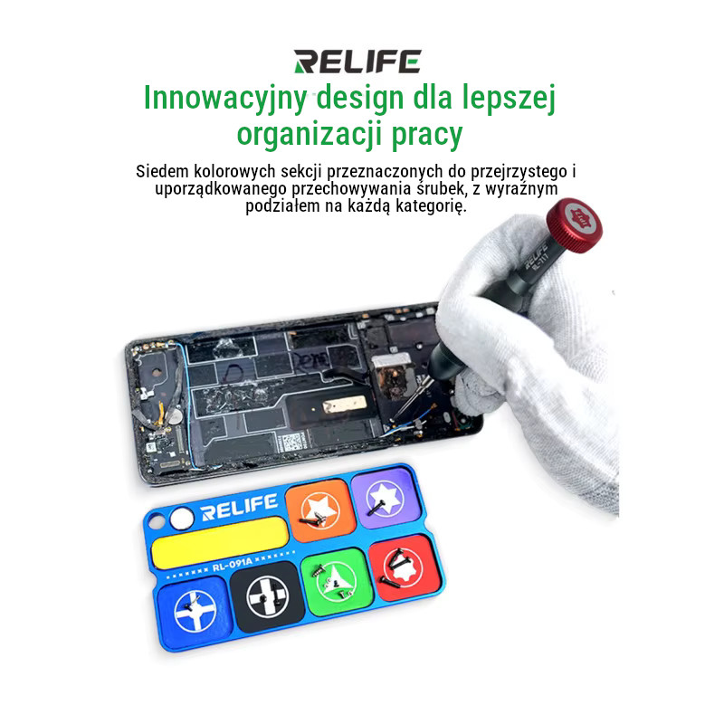 Model RL-091A marki Relife to zaawansowana tacka-organizer wykonana z lekkiego stopu aluminium, posiadająca siedem oddzielnych komór, oraz mocne podłoże magnetyczne — zaprojektowana z myślą o profesjonalnym serwisie elektroniki oraz wymagających pracach naprawczych, gdzie nawet najmniejsza śruba może mieć kluczowe znaczenie.