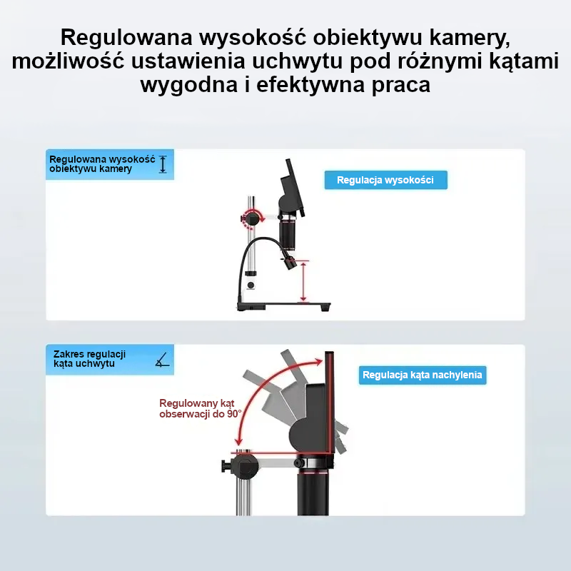 Regulacja wysokości i kąta ustawienia pozwala dopasować mikroskop do stanowiska pracy, co czyni go idealnym narzędziem dla serwisów GSM, elektroników oraz wszystkich zajmujących się precyzyjną naprawą urządzeń