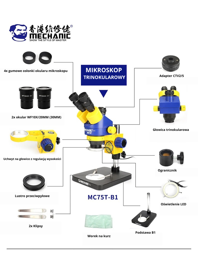 Mikroskop Mechanic MC75T-B1 to narzędzie, które spełni oczekiwania zarówno profesjonalistów, jak i amatorów zajmujących się elektroniką, precyzyjną mechaniką czy nauką. Dzięki swojej wszechstronności, ergonomii oraz możliwości rozbudowy, jest to idealne rozwiązanie dla każdego, kto potrzebuje niezawodnego mikroskopu stereoskopowego najwyższej jakości.