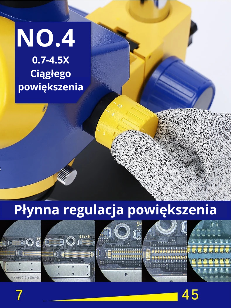 Zakres powiększenia wynosi od 7x do 45x, co pozwala dostosować mikroskop do aktualnych potrzeb. Możliwość zmiany obiektywu dodatkowo rozszerza ten zakres, umożliwiając zwiększenie powierzchni roboczej i poprawienie komfortu pracy przy większych elementach.