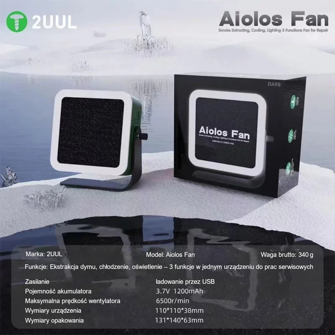 Poznaj 2UUL Aiolos Fan – kompaktowe i nowoczesne urządzenie 3w1, łączące funkcje pochłaniania dymu, chłodzenia i oświetlenia. Idealne dla serwisów GSM, elektroników i hobbystów ceniących wygodę i funkcjonalność w jednym miejscu pracy.