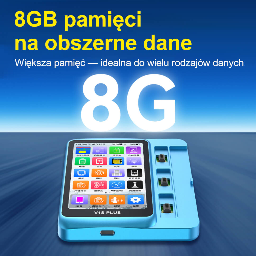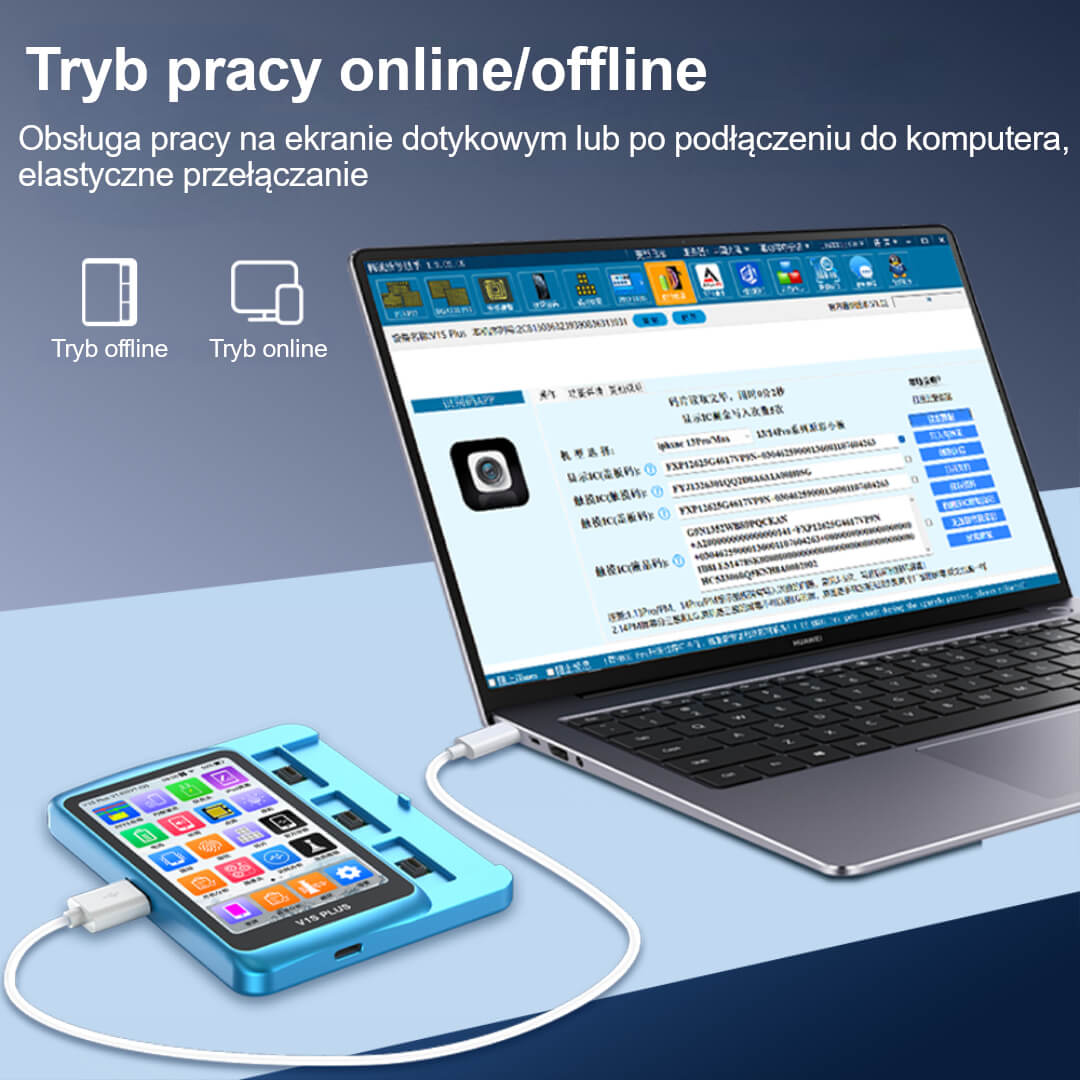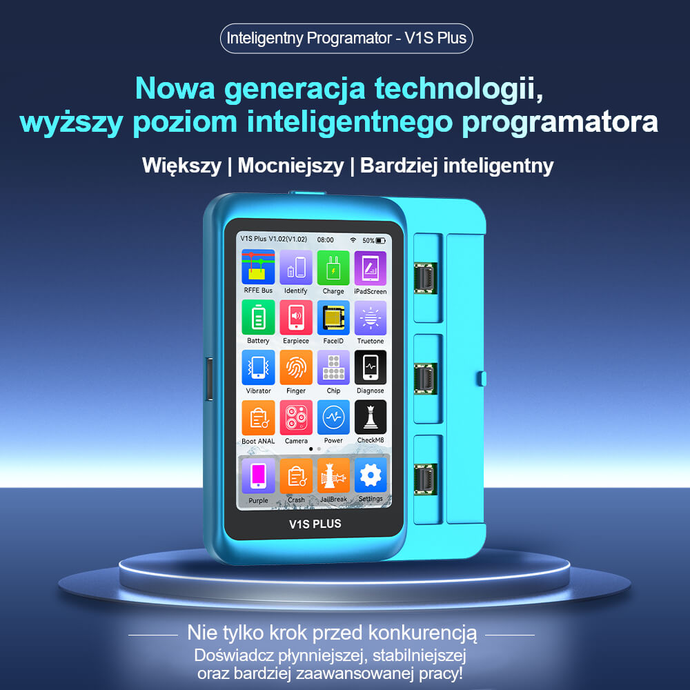 JCID V1S Plus to inteligentny programator nowej generacji, stworzony z myślą o profesjonalnych serwisach GSM. Wyposażony w 4-calowy ekran dotykowy HD, szybką łączność WiFi 2.4G/5G oraz tryb pracy online/offline, umożliwia sprawne programowanie i diagnostykę komponentów w iPhone od 6 do 16PM oraz wybranych modeli iPad.