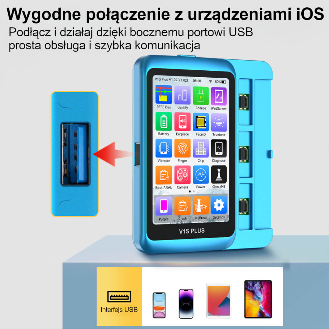 Boczne złącze USB umożliwia tryb plug&play z iPhone i iPad. Prosta komunikacja z urządzeniem skraca czas przygotowania i przyspiesza odczyt oryginalnych danych fabrycznych ekranu, baterii czy innych modułów.