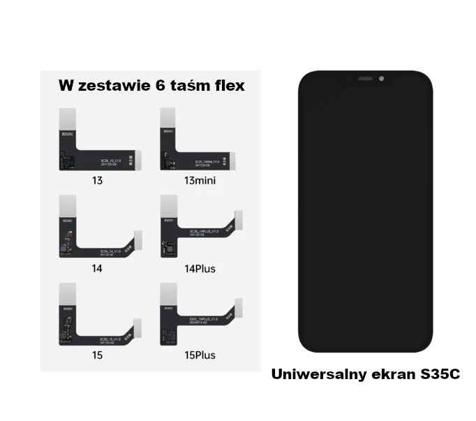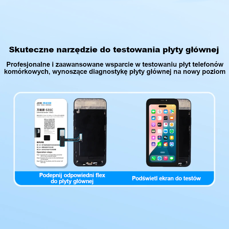 JCID S35C to uniwersalny wyświetlacz testowy stworzony z myślą o profesjonalnych serwisach GSM, które potrzebują szybkiego i wygodnego narzędzia do diagnostyki urządzeń Apple. Konstrukcja 6w1 umożliwia obsługę wielu modeli iPhone przy użyciu odpowiednich taśm flex.