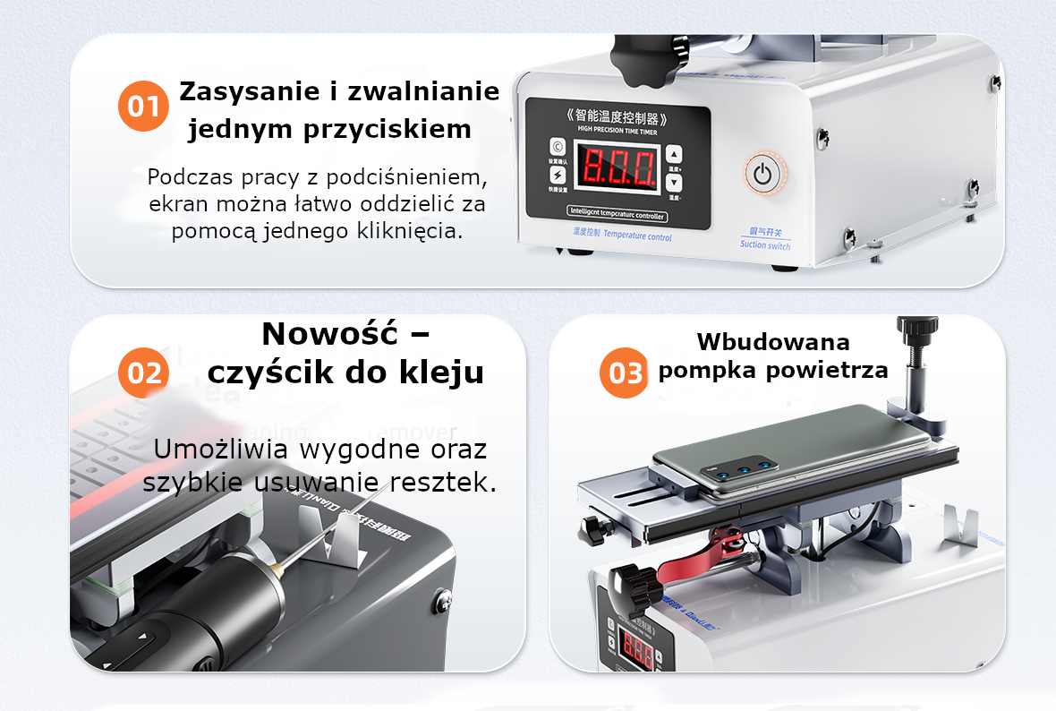 - Zasysanie i zwalnianie jednym przyciskiem – dzięki funkcji próżni, ekran można łatwo oddzielić za pomocą jednego kliknięcia.
