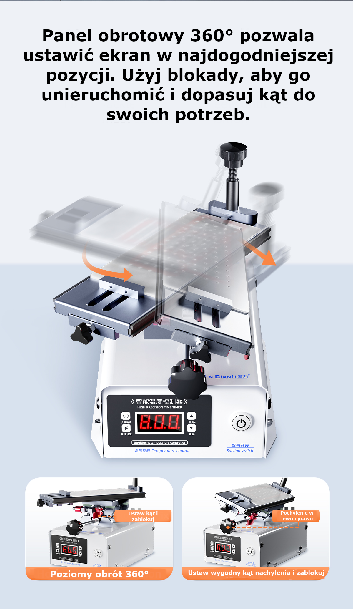 Konstrukcja oparta na obrotowym panelu 360° umożliwia ustawienie telefonu pod dowolnym kątem, co zwiększa wygodę pracy oraz bezpieczeństwo podzespołów. Separator znajduje zastosowanie w procesach takich jak rozdzielanie wyświetlacza, wymiana baterii czy dostęp do płyty głównej – szczególnie w urządzeniach o konstrukcji unibody