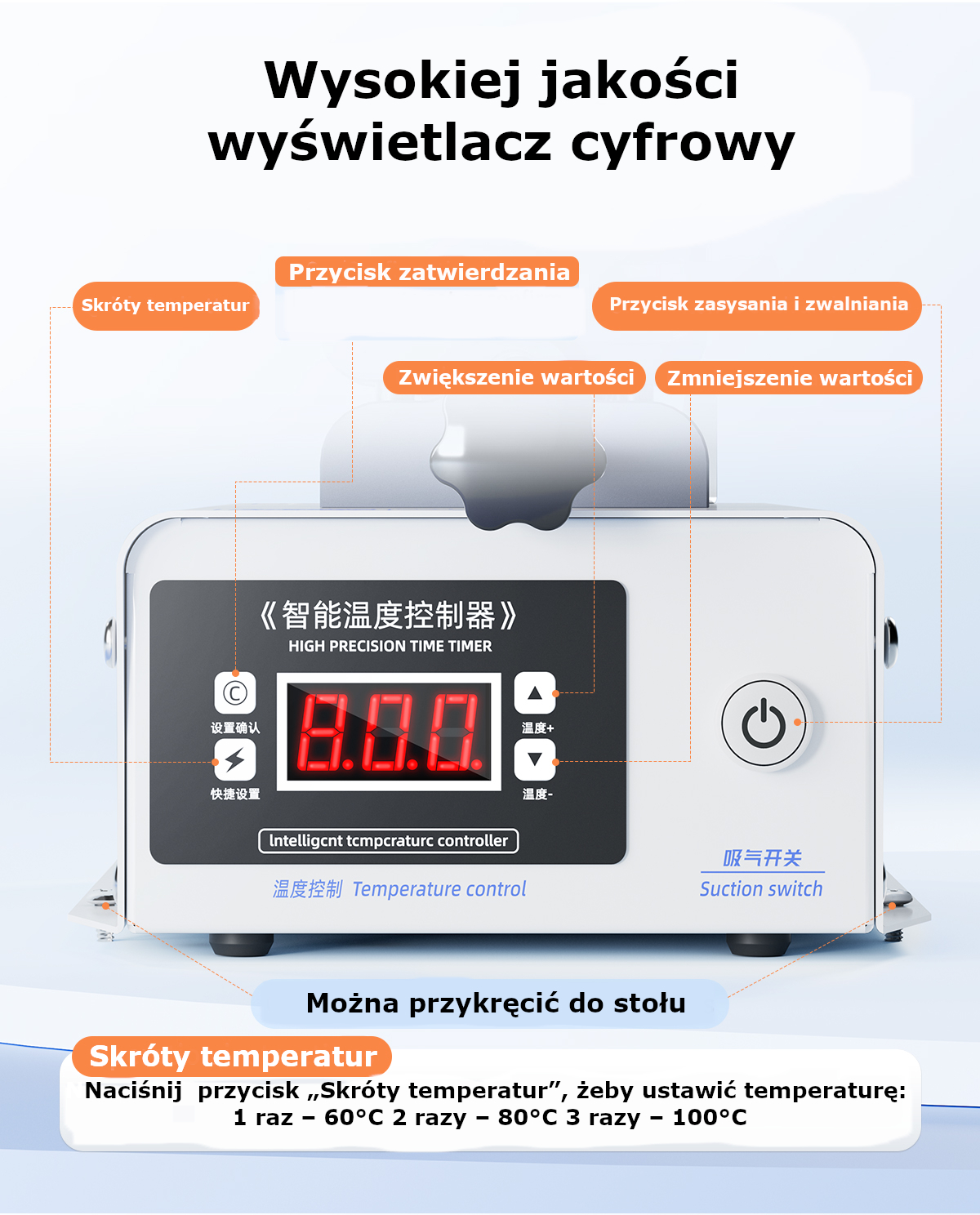 - Cyfrowy wyświetlacz – prosty w obsłudze interfejs z możliwością ustawienia temperatury, co przyspiesza oddzielanie ekranów.