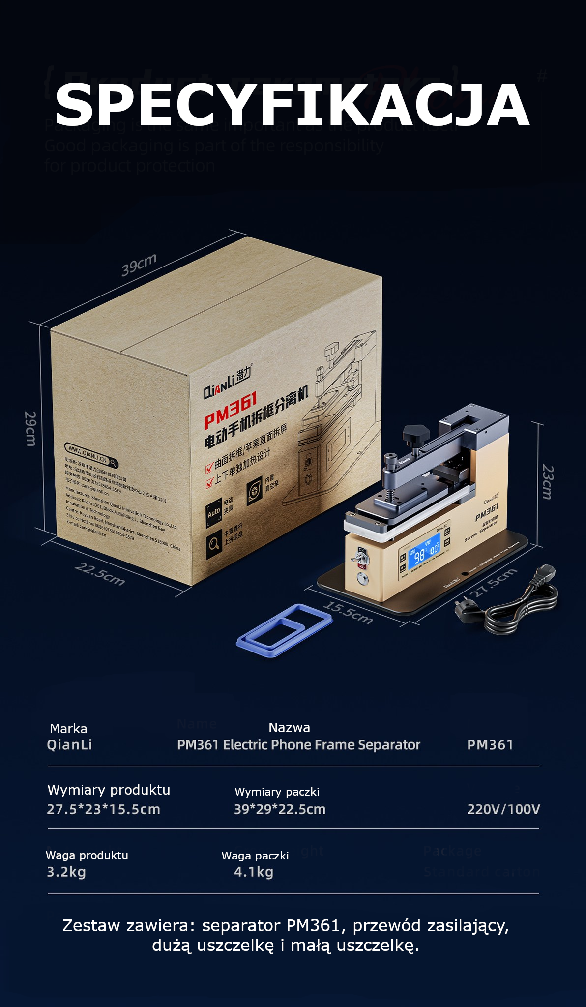 QianLi PM361 to zaawansowane narzędzie serwisowe do precyzyjnego demontażu ekranów oraz szklanych tylnych pokryw w smartfonach. Wyposażony w system ogrzewania z dwóch stron, elektryczny zacisk z przyssawką i płynne sterowanie dociskiem, zapewnia bezpieczną, wydajną i wygodną pracę nawet przy najbardziej wymagających naprawach. Kompaktowa konstrukcja oraz możliwość regulacji długości obszaru roboczego sprawiają, że jest to niezastąpione urządzenie w każdym profesjonalnym serwisie.