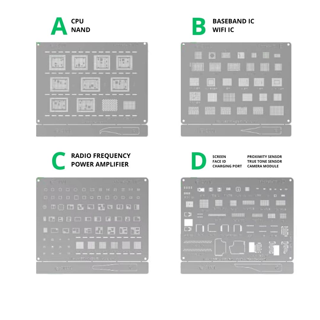 2UUL BG01 to profesjonalny zestaw czterech szablonów reballingowych (A, B, C, D), przeznaczony do napraw układów BGA w iPhone’ach od modelu 8 do 16 Pro Max. Precyzyjne otwory i wysoka jakość wykonania gwarantują równomierne nanoszenie kulek lutowniczych oraz niezawodne efekty pracy.
