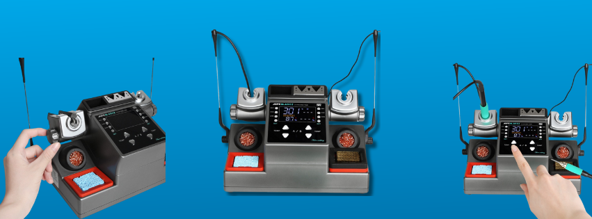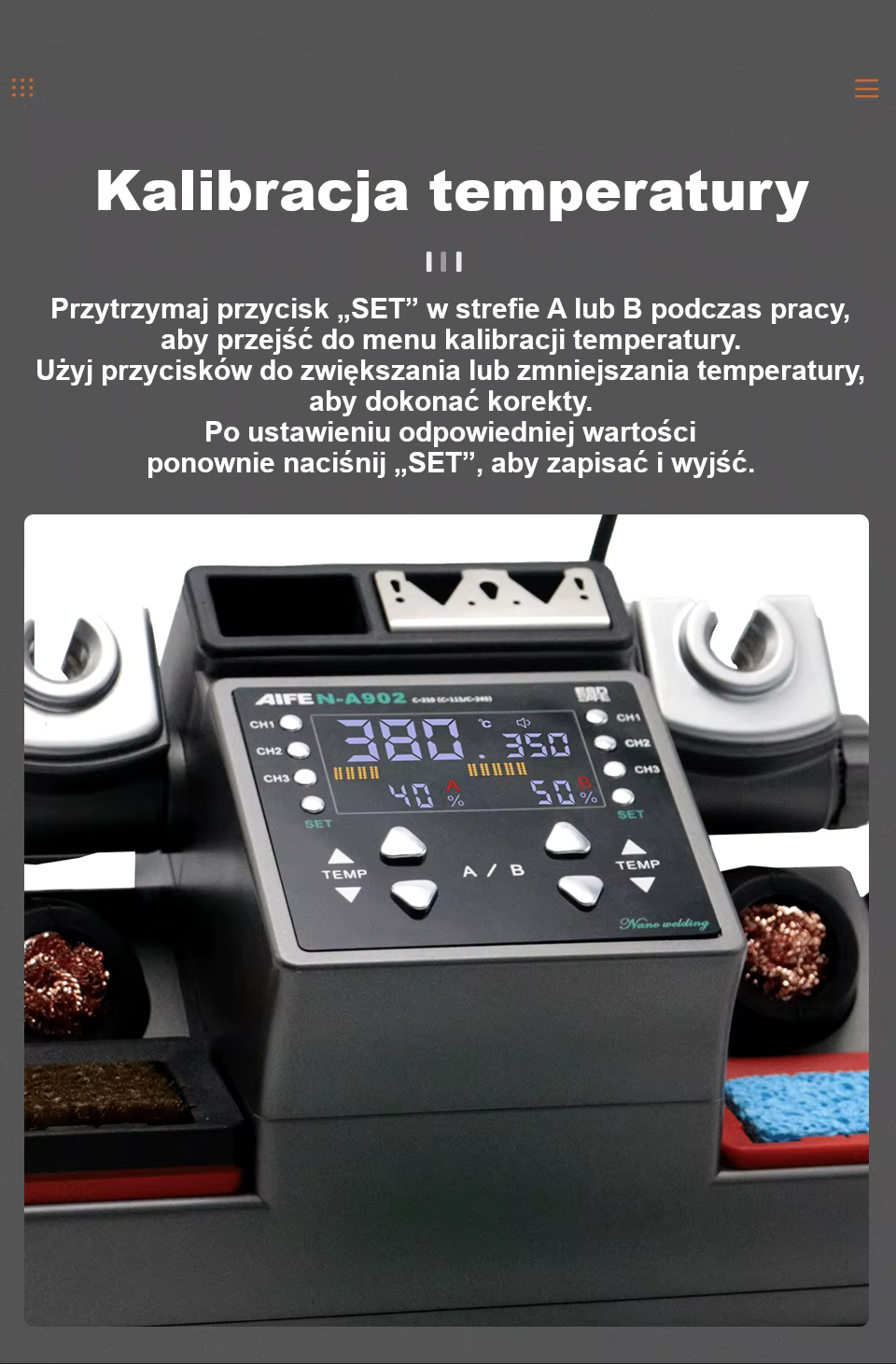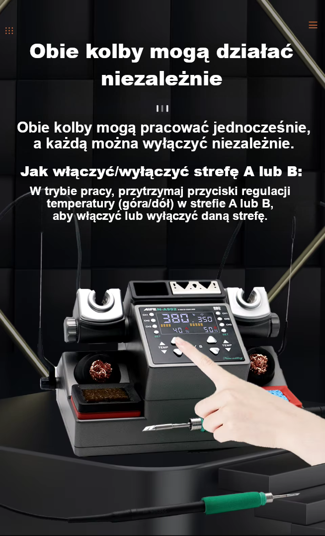 Dwukanałowa stacja od podmarki Sugona czyli Aifen A902. Stacja obsługuje kolby na groty JBC można jednocześnie używać dwóch z nich. Można do niej podłączyć trzy najpopularniejsze rączki czyli 115 / 210 / 245, które są w zestawie.