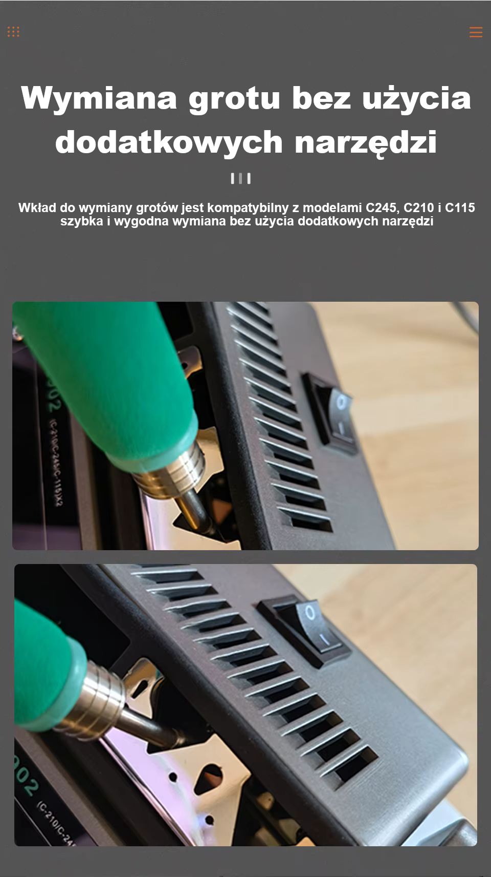 *Zalecamy korzystanie z oryginalnych grotów JBC, dzięki którym zyskasz najwyższą precyzję, lepszą przewodność cieplną i dłuższą żywotność. Zamienniki grotów nie wykorzystują pełnych możliwości stacji, powodując spadek wydajności i funkcjonalności, co znacznie wydłuży czas wykonywanej pracy.