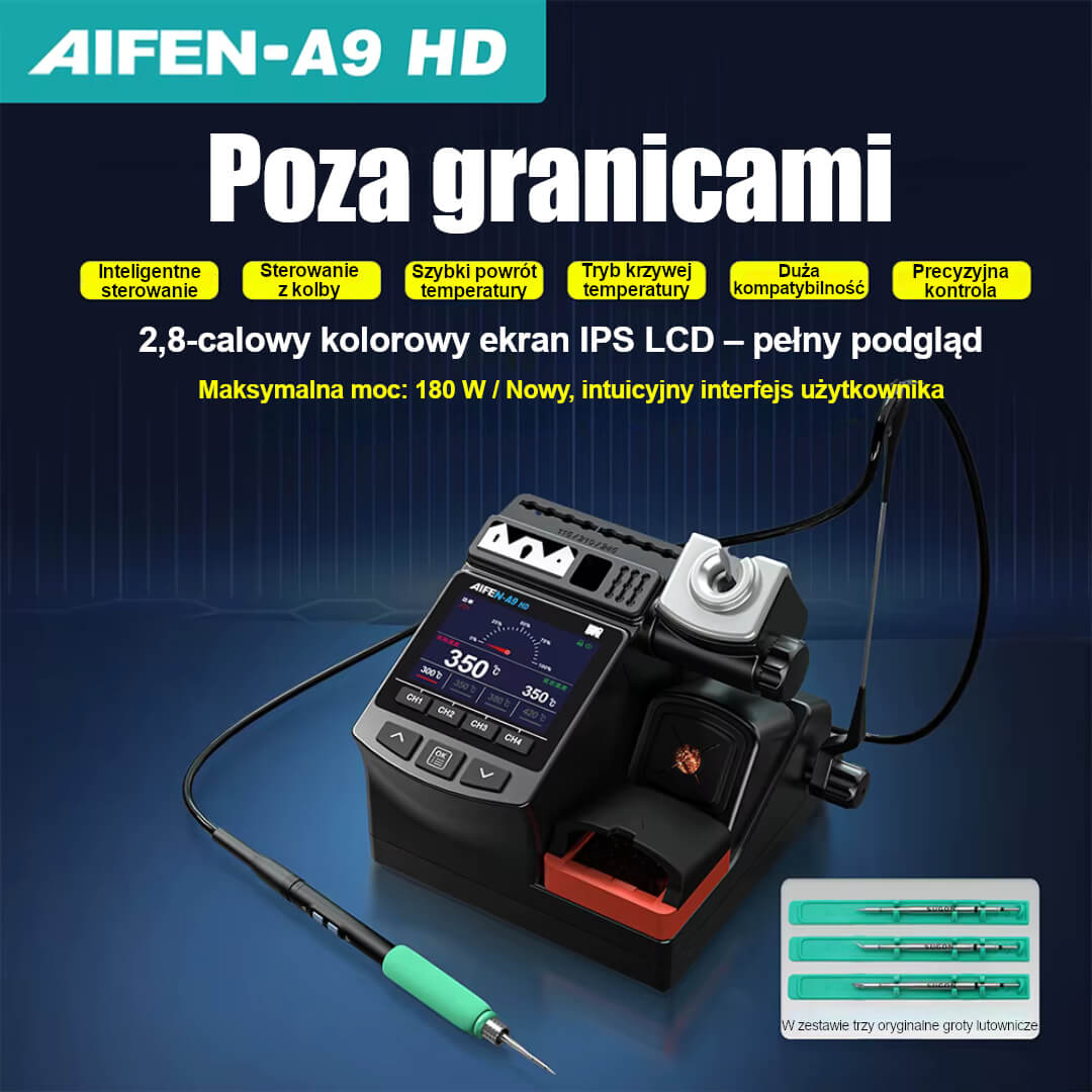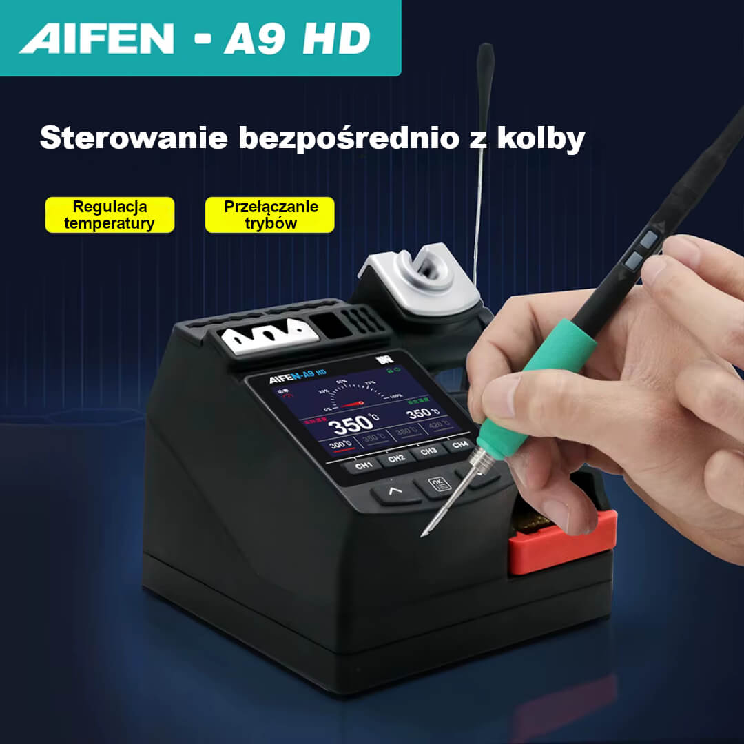 Aifen A9HD to profesjonalna stacja lutownicza o mocy 180 W, zaprojektowana do szybkiego nagrzewania i stabilnej pracy w zakresie 100–450 °C. Sprawdza się w serwisie GSM i elektronice precyzyjnej: płyty główne, układy CPU/BGA, cynowanie oraz czyszczenie padów.