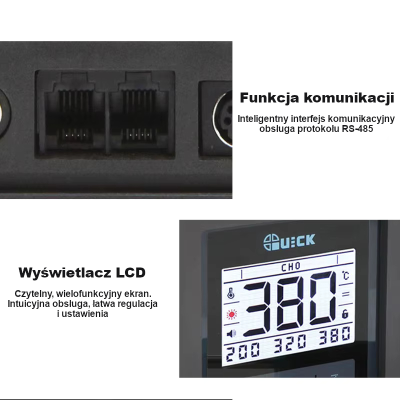 QUICK TV2 posiada interfejs komunikacyjny RS-485, przydatny w zastosowaniach stanowiskowych i serwisowych. Na ekranie widzisz m.in. status temperatury, jednostkę (°C/°F), sygnalizację nagrzewania oraz aktywne presety.