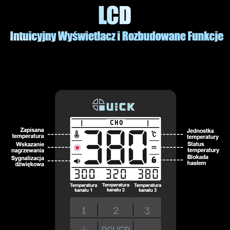 LCD: zapisane presety, status nagrzewania, jednostka i stan temperatury oraz blokada ustawień.