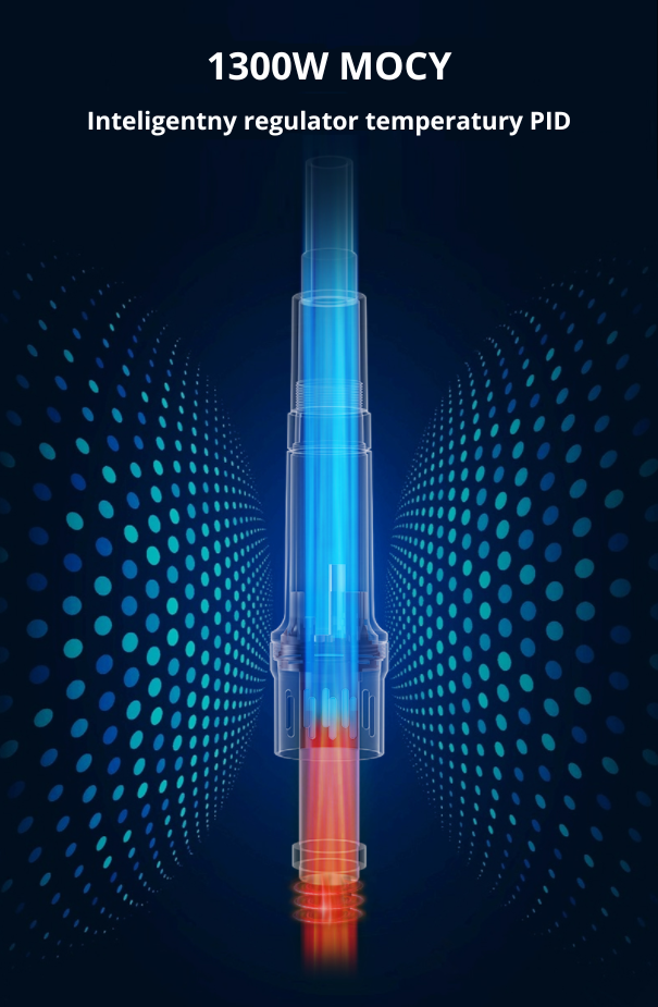 - Moc 1300 W pozwala na szybkie osiągnięcie temperatur w zakresie 50°C – 550°C, gwarantując stabilność i brak skoków temperatury podczas dogrzewania.