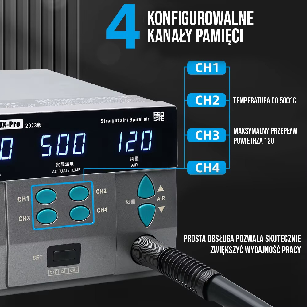 Cyfrowy wyświetlacz umożliwia dokładne ustawienie temperatury i siły nadmuchu, a inteligentny system kontroli gwarantuje utrzymanie stałych parametrów pracy. Stacja oferuje regulację przepływu powietrza oraz funkcję automatycznego chłodzenia i tryb uśpienia, co zwiększa żywotność elementu grzewczego.