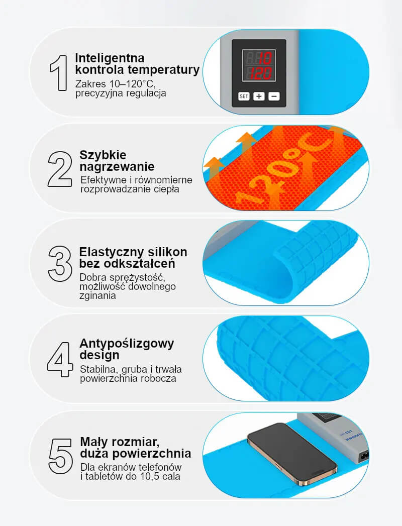 Zakres pracy od 10°C do 130°C pozwala dostosować urządzenie do różnych typów ekranów i klejów. Cyfrowy wyświetlacz LED oraz przyciski SET / + / – umożliwiają łatwą i intuicyjną obsługę.