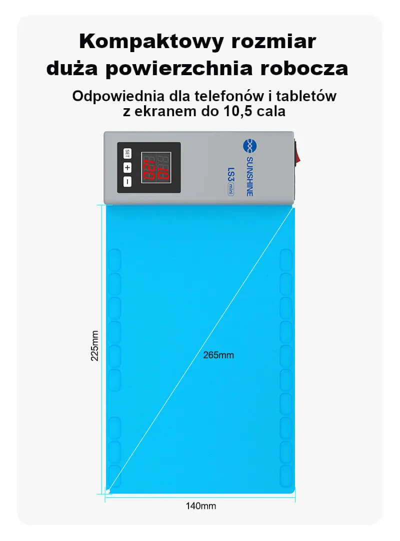 Mimo niewielkich gabarytów, Sunshine LS3 Mini oferuje powierzchnię roboczą 225 × 140 mm, co pozwala komfortowo pracować z ekranami smartfonów i tabletów do 10,5 cala.