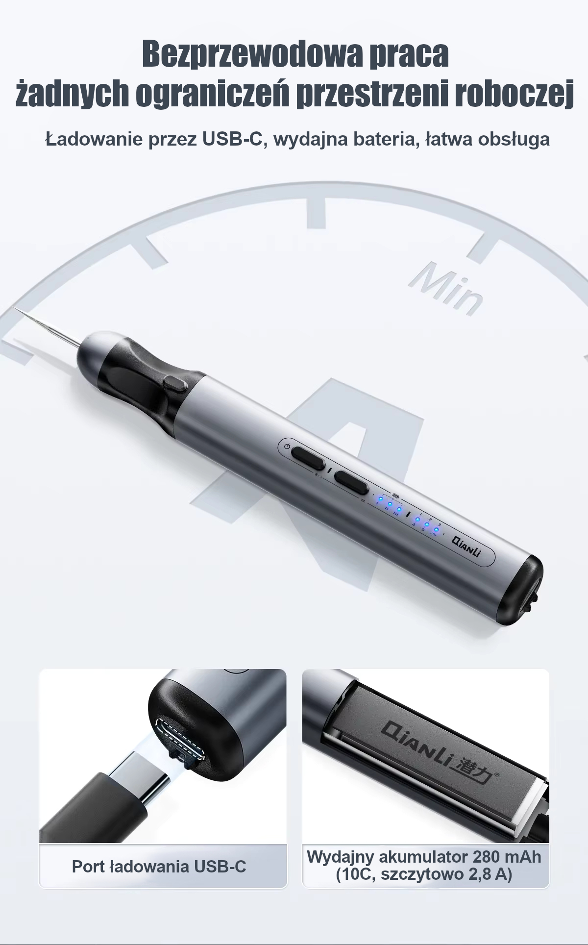QianLi iHandy DM360-K to profesjonalna mini szlifierka stworzona z myślą o serwisach GSM i elektroniki. Dzięki kompaktowym wymiarom i wadze zaledwie 72 g, urządzenie zapewnia wygodę i precyzję w każdej sytuacji. Bezprzewodowa konstrukcja z akumulatorem 280 mAh pozwala na swobodną pracę bez ograniczeń przewodami.