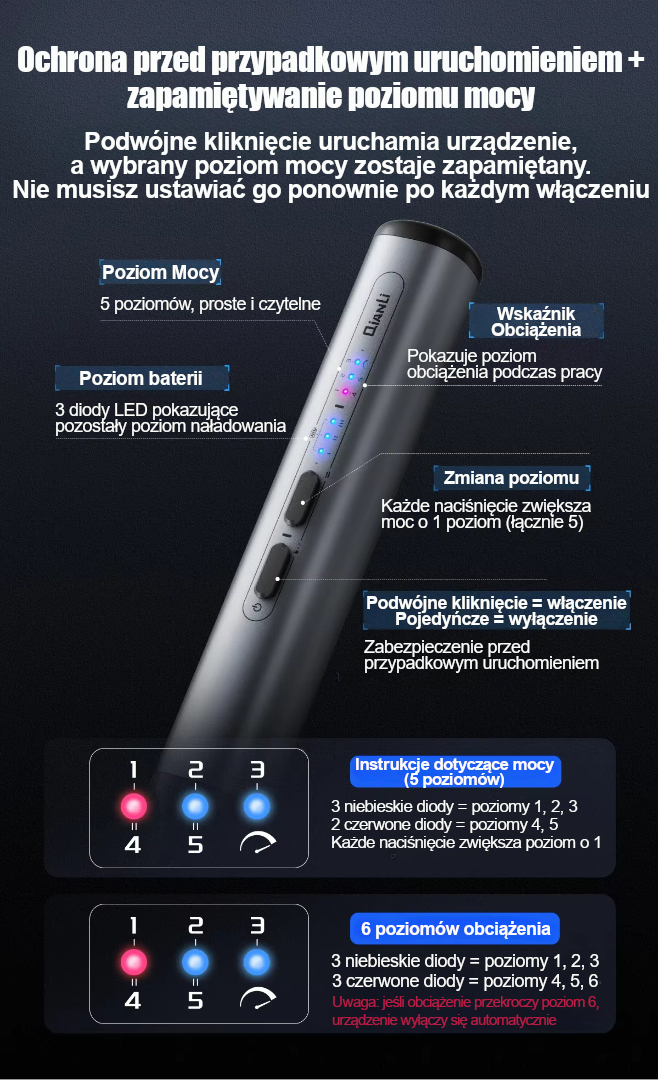 | Wskaźniki | LED: poziom mocy (5), poziom baterii (3), obciążenie w czasie rzeczywistym |