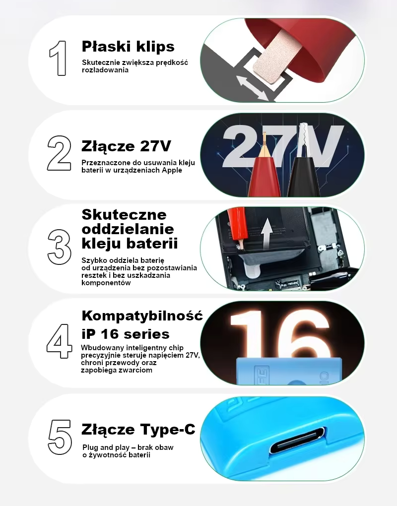 - Szybkie, czyste oddzielanie baterii bez pozostałości kleju