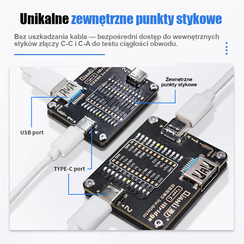 - Test bez uszkadzania kabla – zewnętrzne punkty stykowe zapewniają dostęp do wewnętrznych pinów.