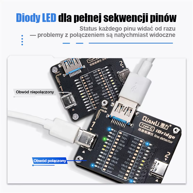 Dzięki zewnętrznym punktom stykowym urządzenie zapewnia bezpośredni dostęp do wewnętrznych pinów złącza, a wskaźniki LED pozwalają szybko ocenić stan połączenia każdego pinu. To wygodne rozwiązanie do wykrywania przerw i problemów w kablach ładowania oraz transmisji danych.